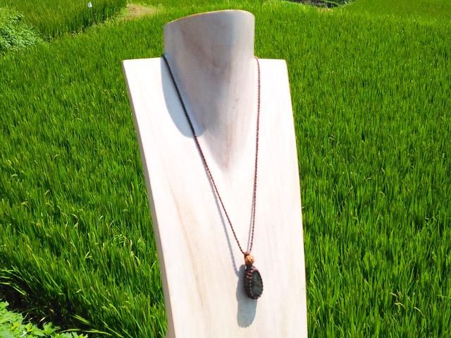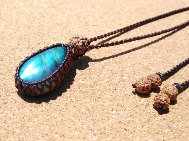 海外で直接買い付け、ひとつひとつ丁寧に選び抜いた天然石ラブラドライトとルドラクシャ(菩提樹の実)をマクラメのロウ引き紐で丁寧に編み込みんだマクラメネックレス・ペンダントです。