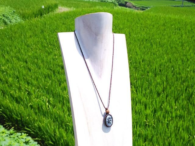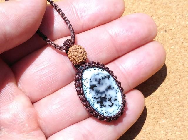 海外で直接買い付け、ひとつひとつ丁寧に選び抜いた天然石デンドライトオパールとルドラクシャ(菩提樹の実)をマクラメのロウ引き紐で丁寧に編み込みんだマクラメネックレス・ペンダントです。