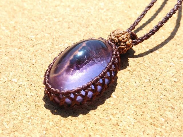 海外で直接買い付け、ひとつひとつ丁寧に選び抜いたアメジストとルドラクシャ(菩提樹の実)をマクラメのロウ引き紐で丁寧に編み込みんだマクラメネックレス・ペンダントです。