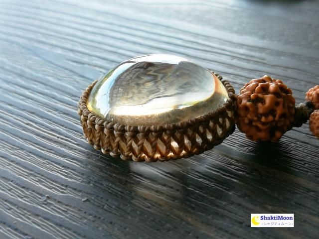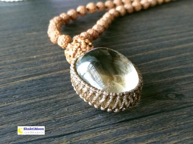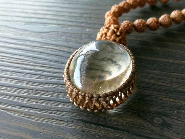 ぷっくりとかわいい優しい色合いのスモーキークォーツをマクラメのロウ引き紐で包み込み、108+1のルドラクシャと組み合わせました。