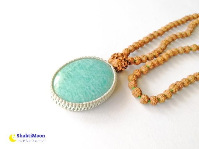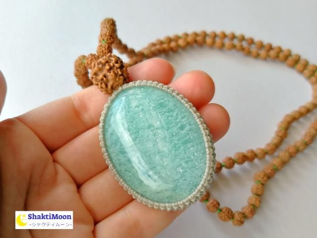 光によりキラキラ輝くかわいい特大アマゾナイトをマクラメのロウ引き紐で包み込み、108+1のルドラクシャと組み合わせました。