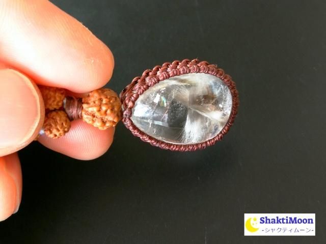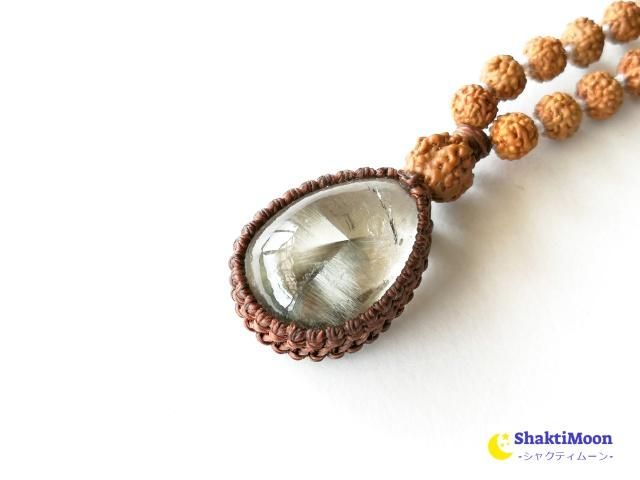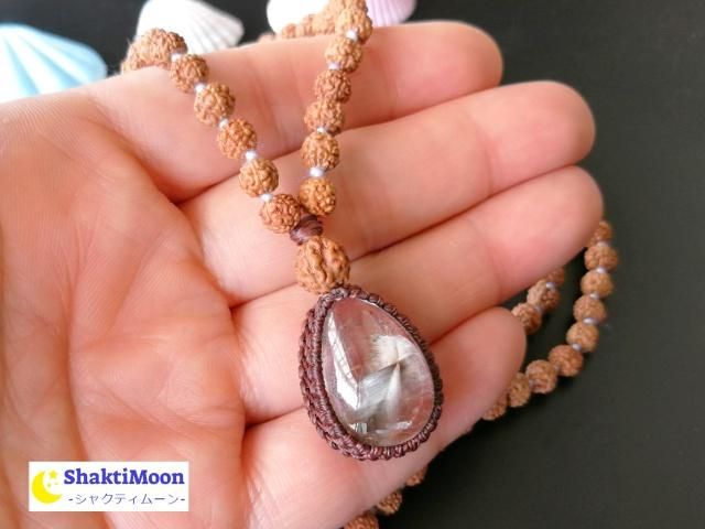 約5mmの小粒ルドラクシャととってもレアな「奇跡の鉱物」とも呼ばれるプラチナルチルクォーツをマクラメのロウ引き紐で包み込み、108+1のルドラクシャと組み合わせました。