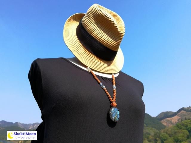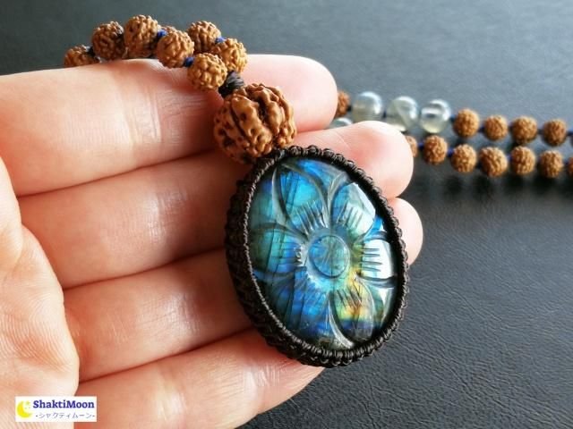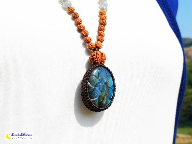 【インスピレーション(直感力)を高めたいあなたへ!コレクターズ・フラワーカービング・マルチカラーラブラドライト39】ルドラクシャマーラーペンダント(菩提樹の実)第5・6チャクラ対応