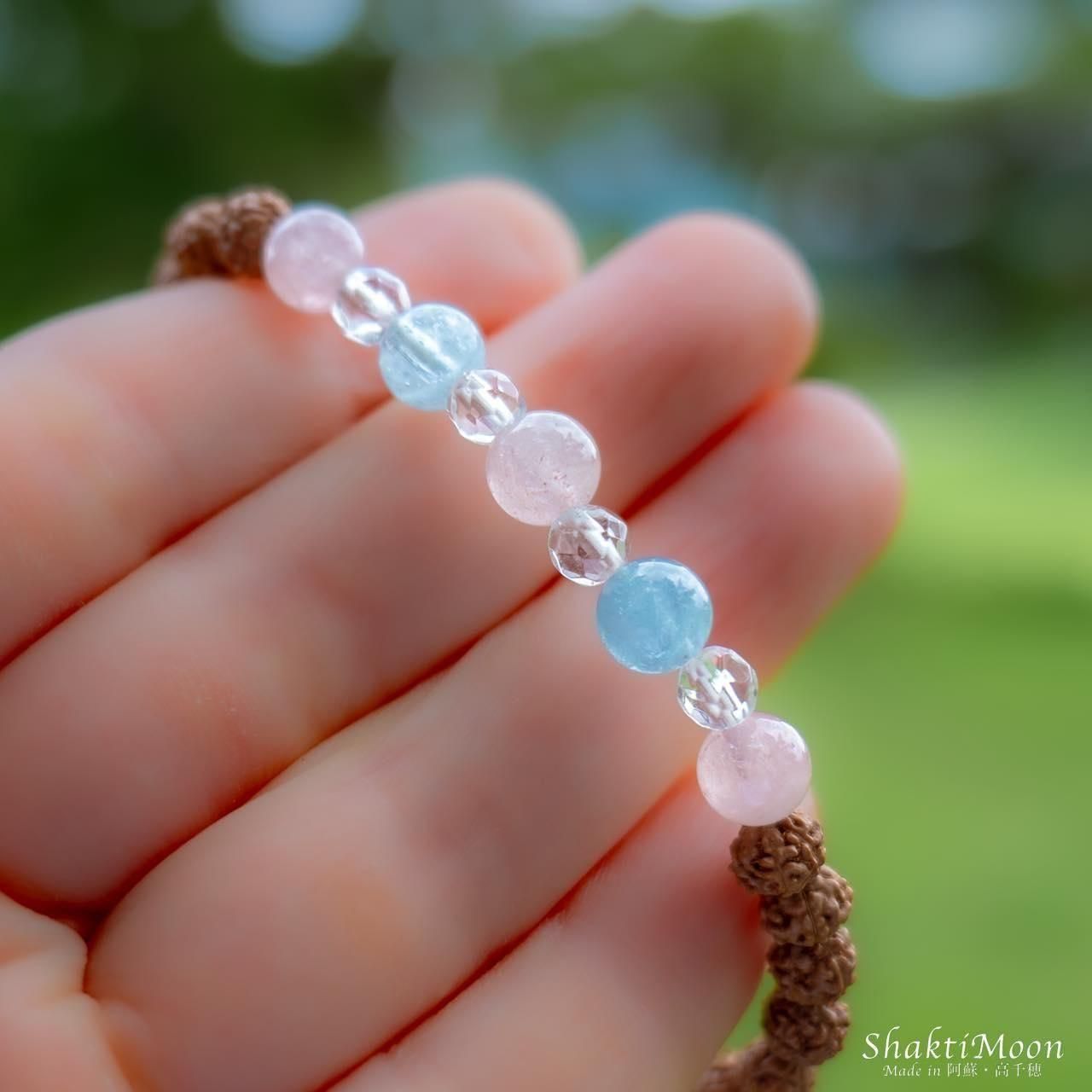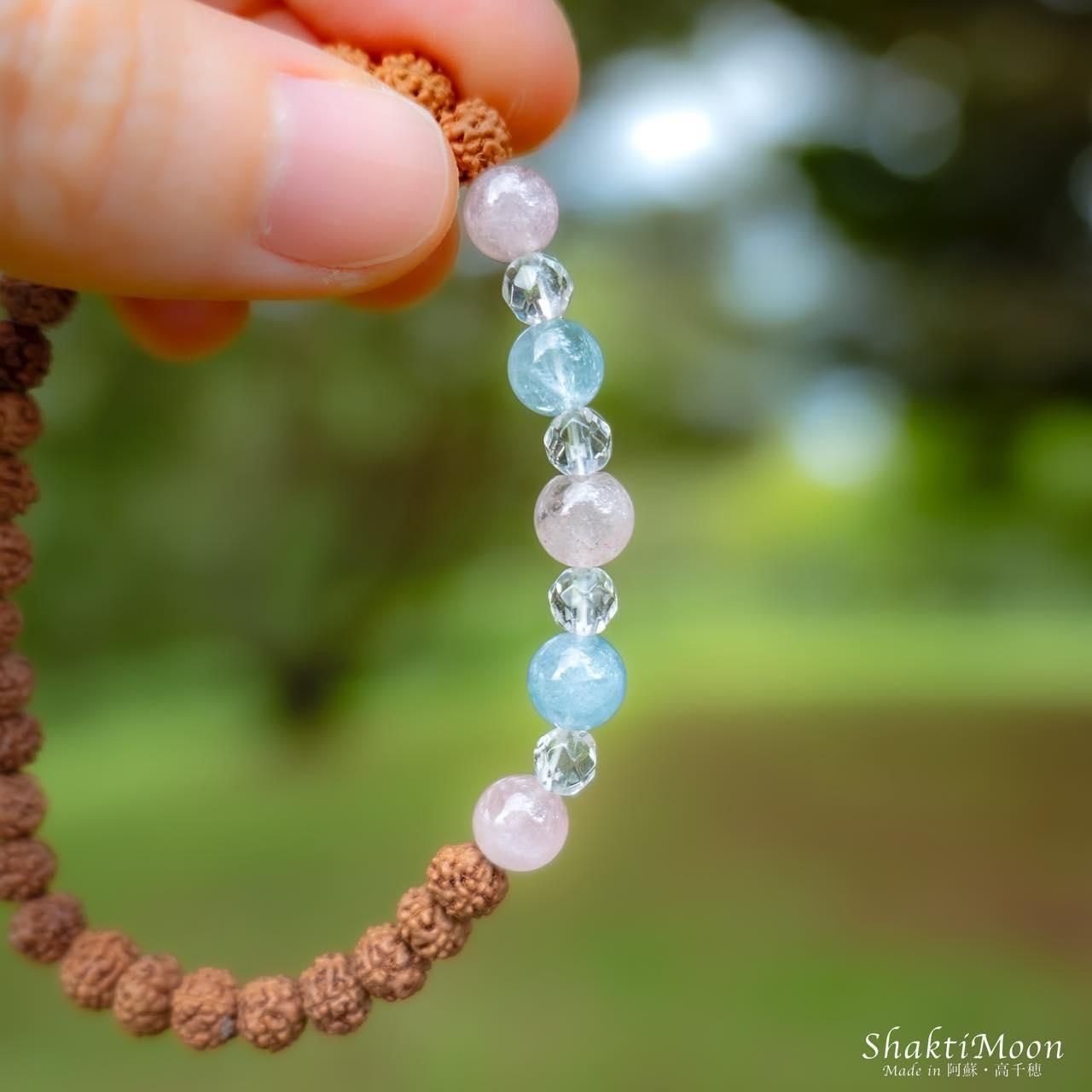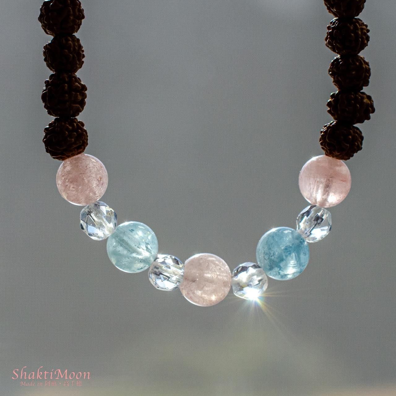 貴重な小粒ルドラクシャと明るく柔らかな色合いがかわいい透明感もあるアクアマリンやモルガナイトなどのミックスベリルを組み合わせました☆