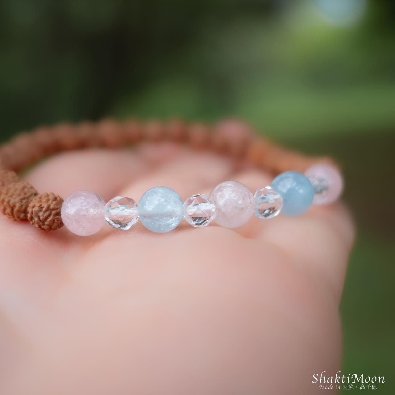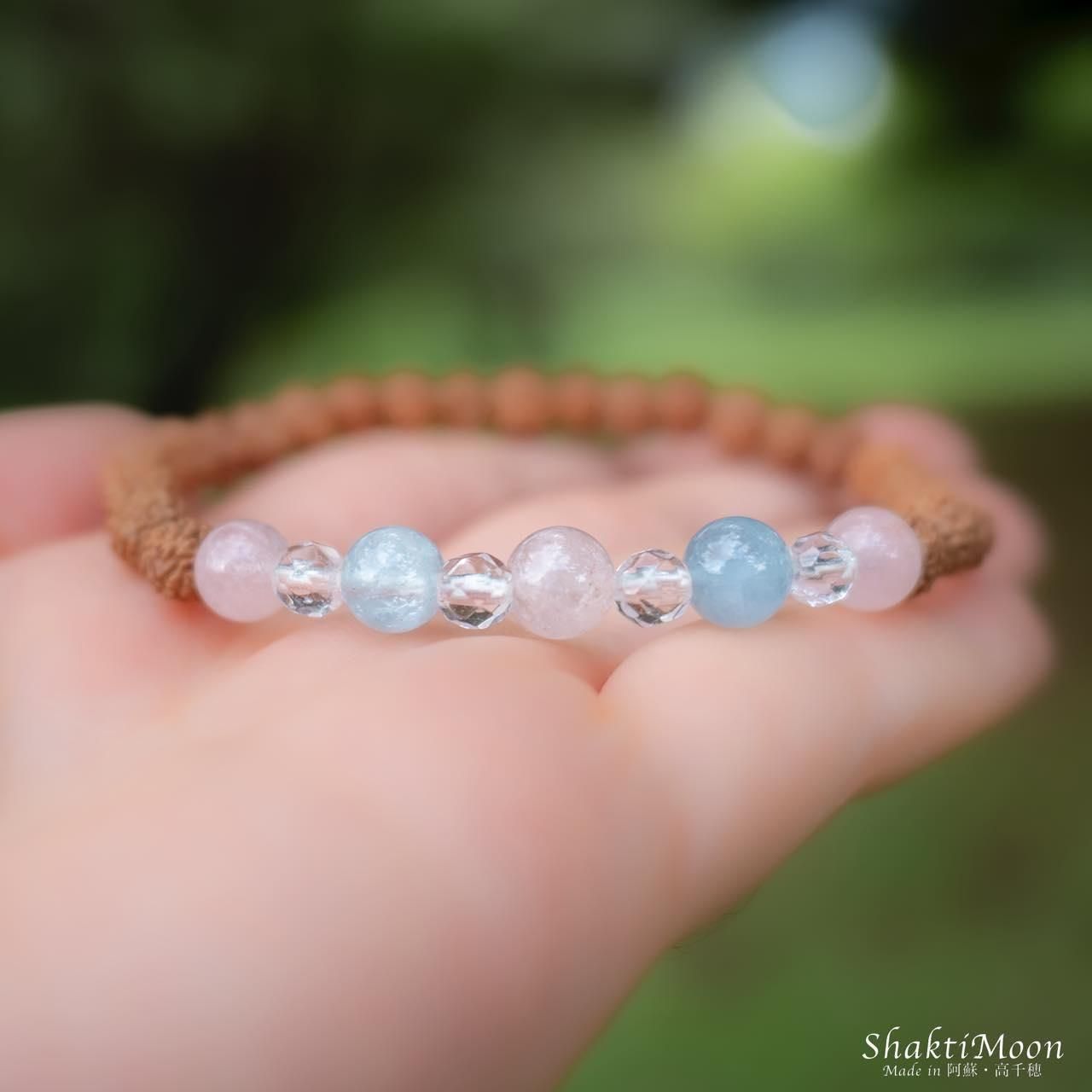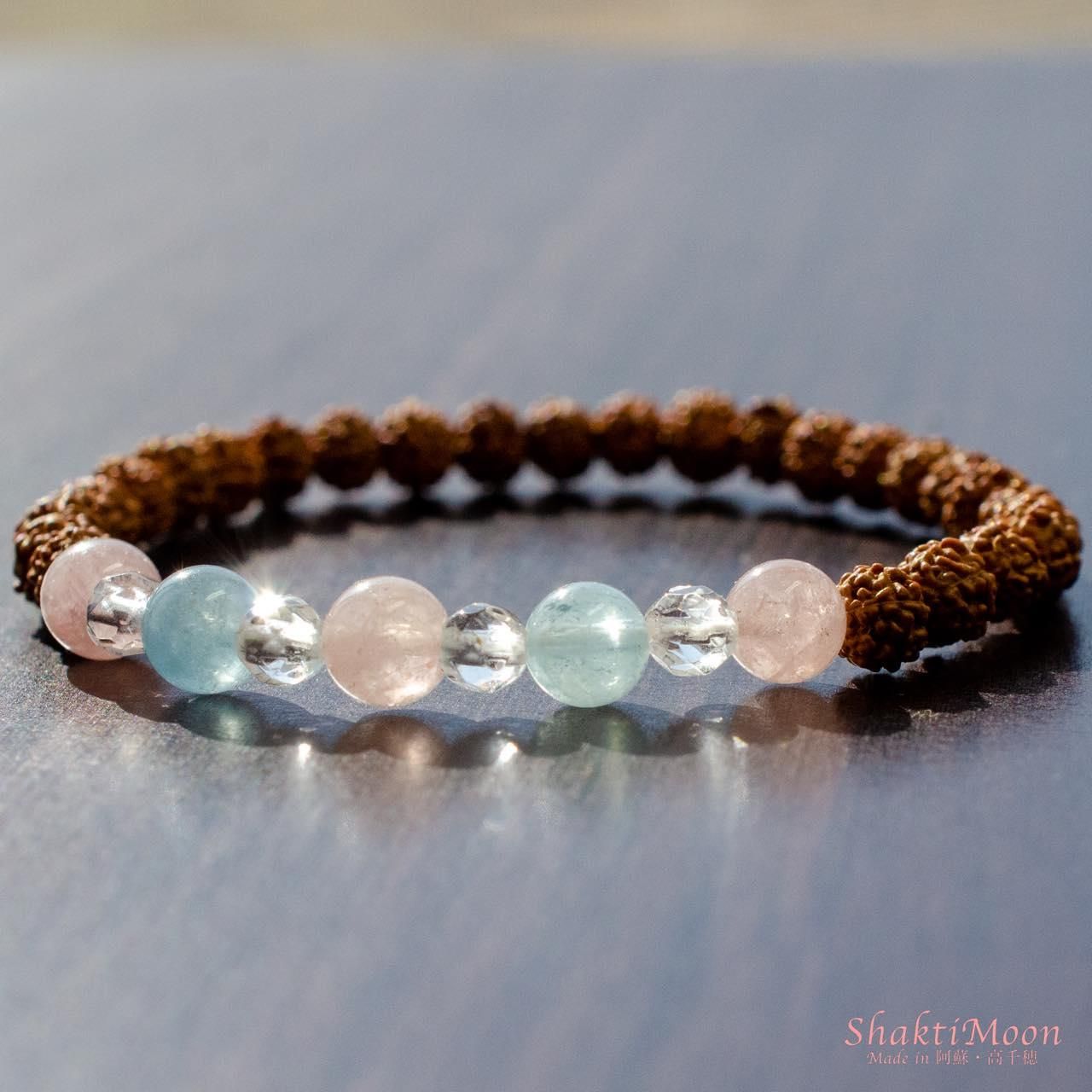 貴重な小粒ルドラクシャと明るく柔らかな色合いがかわいい透明感もあるアクアマリンやモルガナイトなどのミックスベリルを組み合わせました☆