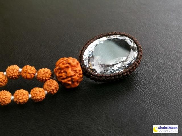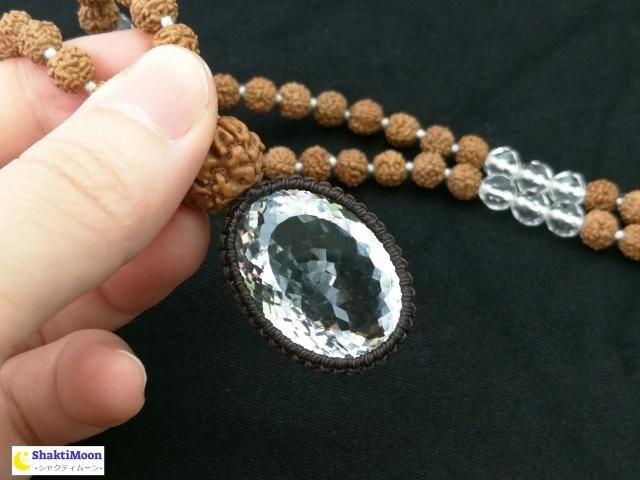 108+1のルドラクシャ(菩提樹の実)&カット水晶ビーズと組み合わせました。