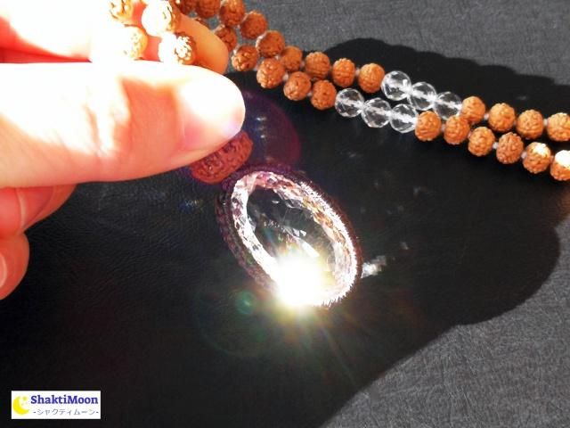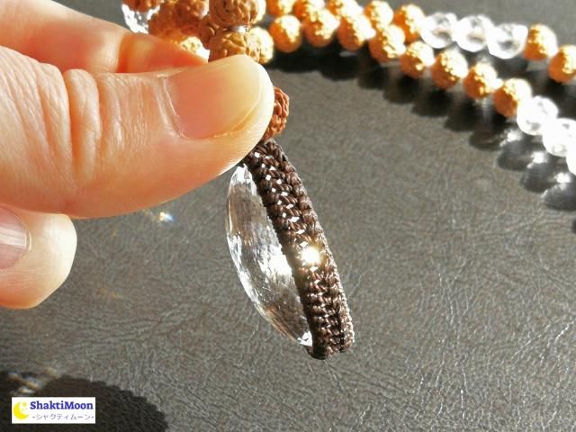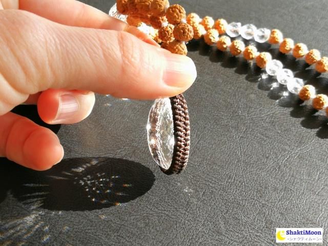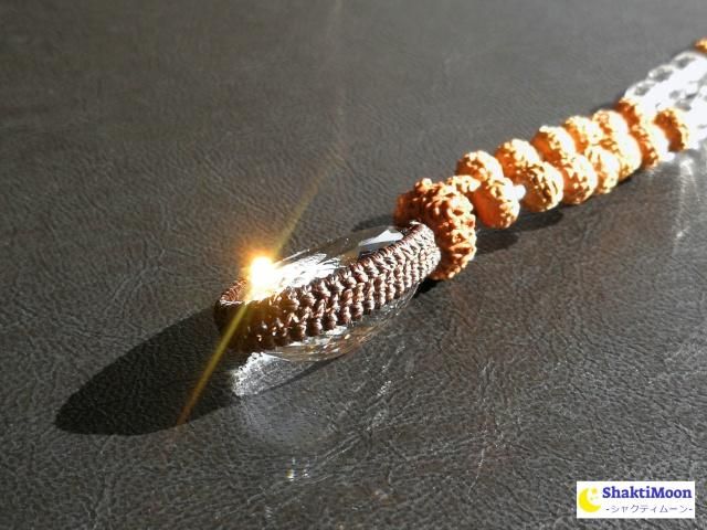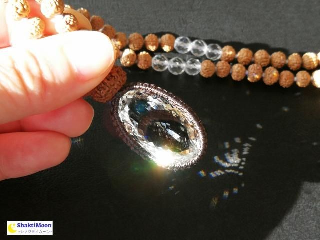 マーラー部分にはとっても滑らかで上品な触り心地の高品質ルドラクシャを使い、キラキラと輝くプレミアムカット水晶ビーズと組み合わせ、
