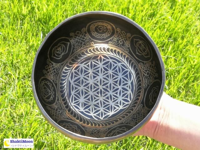 【1点もの!送料無料・17cm・第1チャクラ対応・ハンドメイドシンギングボウル97】フラワーオブライフ・7チャクラシンボル・吉祥紐・チベタンマントラ・ダブルドルジェ(ヴァジュラ・金剛杵)