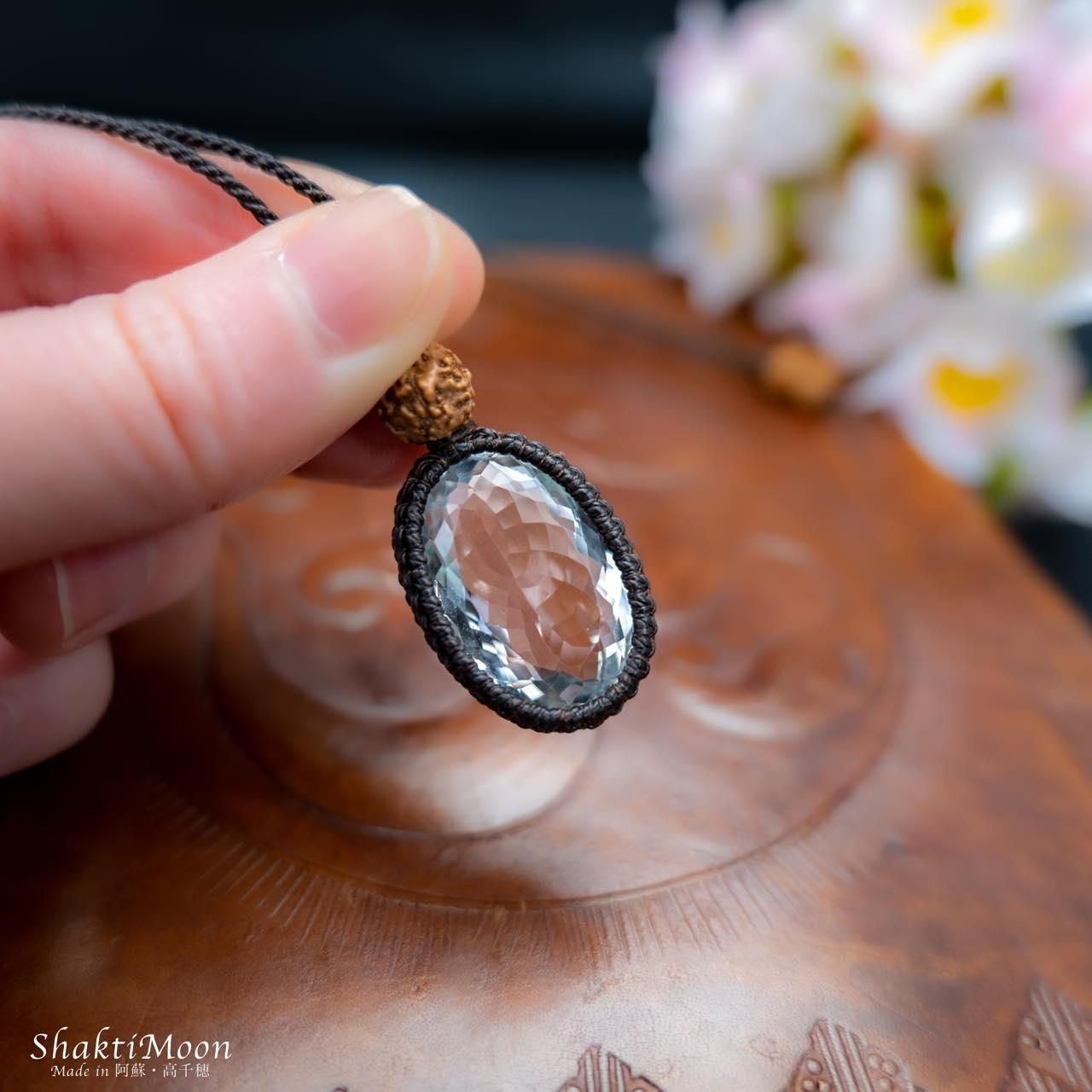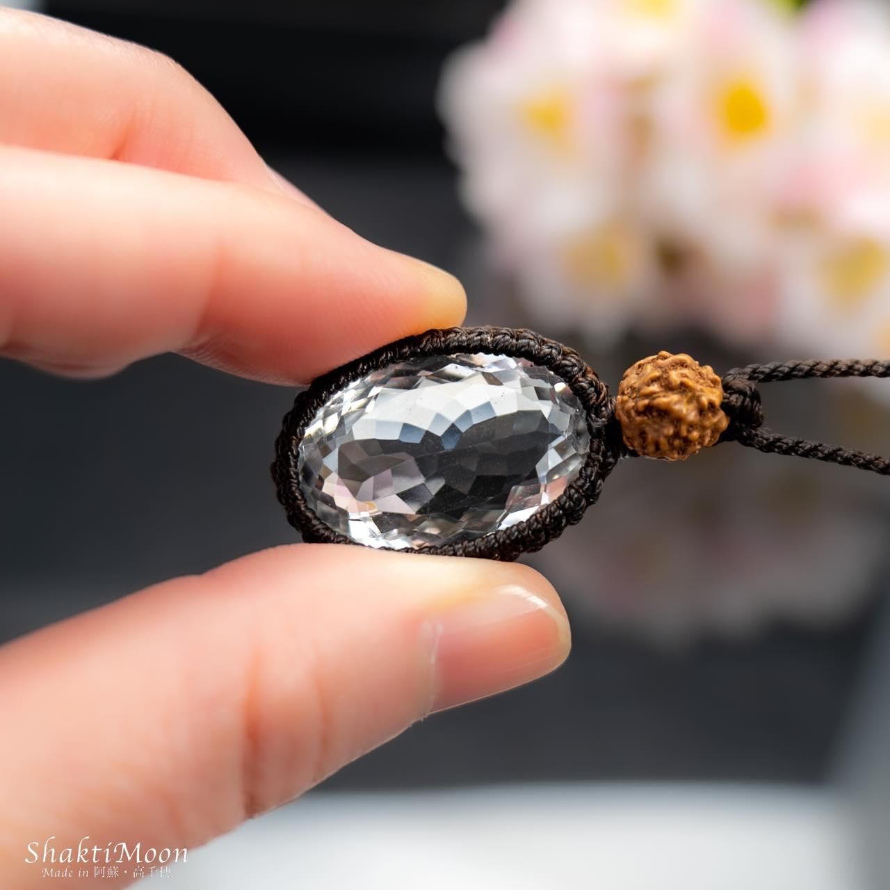 プレミアムカット水晶の上にルドラクシャをひと粒組み合わせ、後ろからも持ち主様をお守りしてくれるように紐のエンド部分に2粒ずつルドラクシャをお付けいたしました!