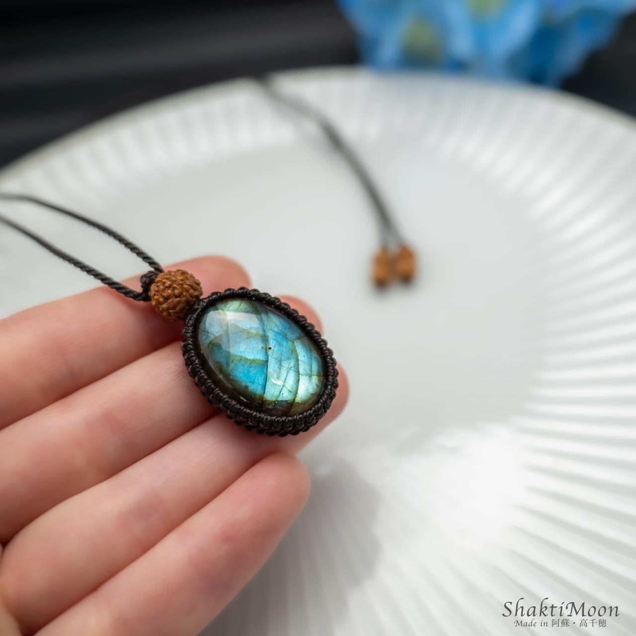 ラブラドライトの上に6面のルドラクシャをひと粒組み合わせ、後ろからも持ち主様をお守りしてくれるように紐のエンド部分に2粒ずつ5面ルドラクシャをお付けいたしました!