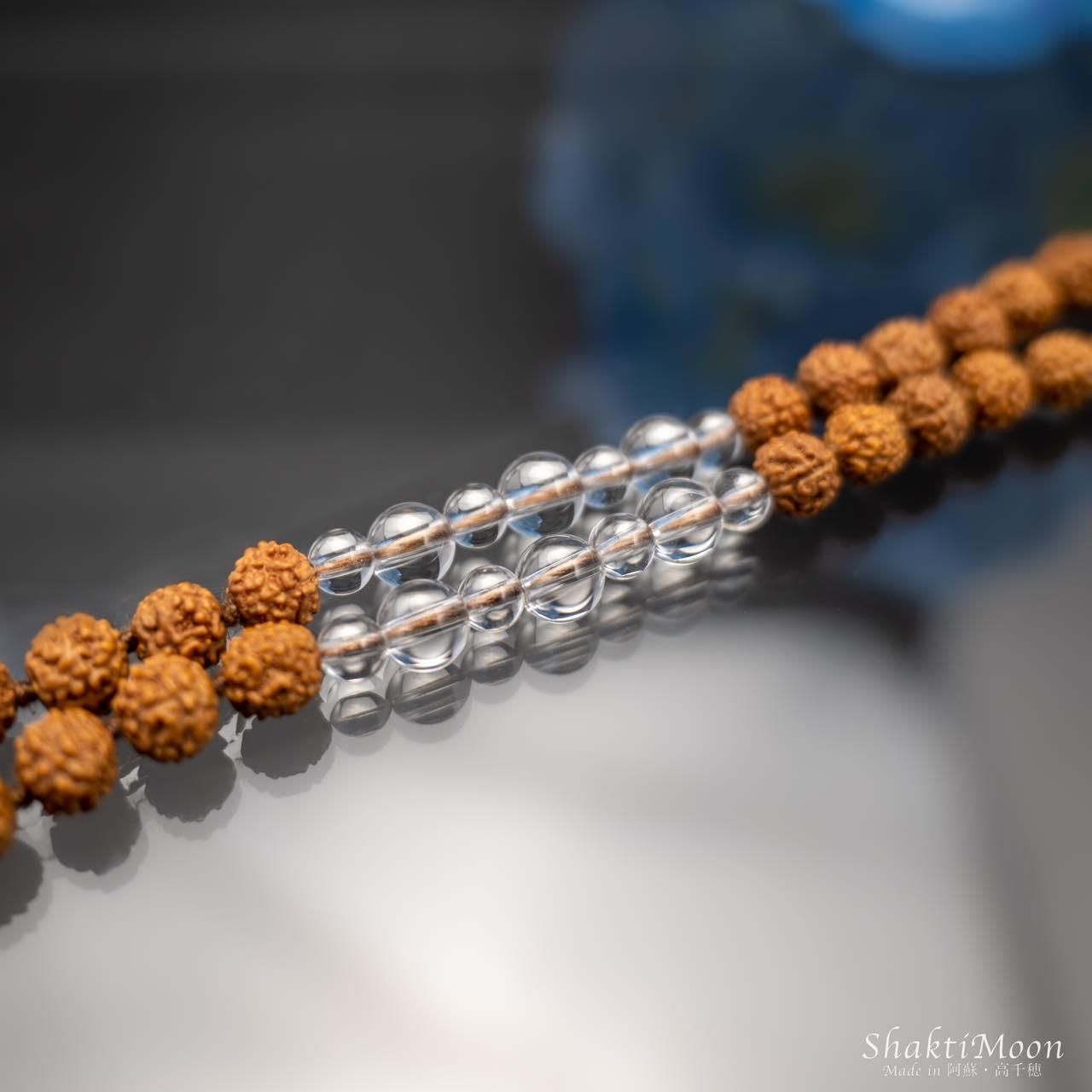 マーラー部分には滑らかで上品な触り心地の高品質ルドラクシャを使い、高品質水晶ビーズを贅沢に組み合わせました。