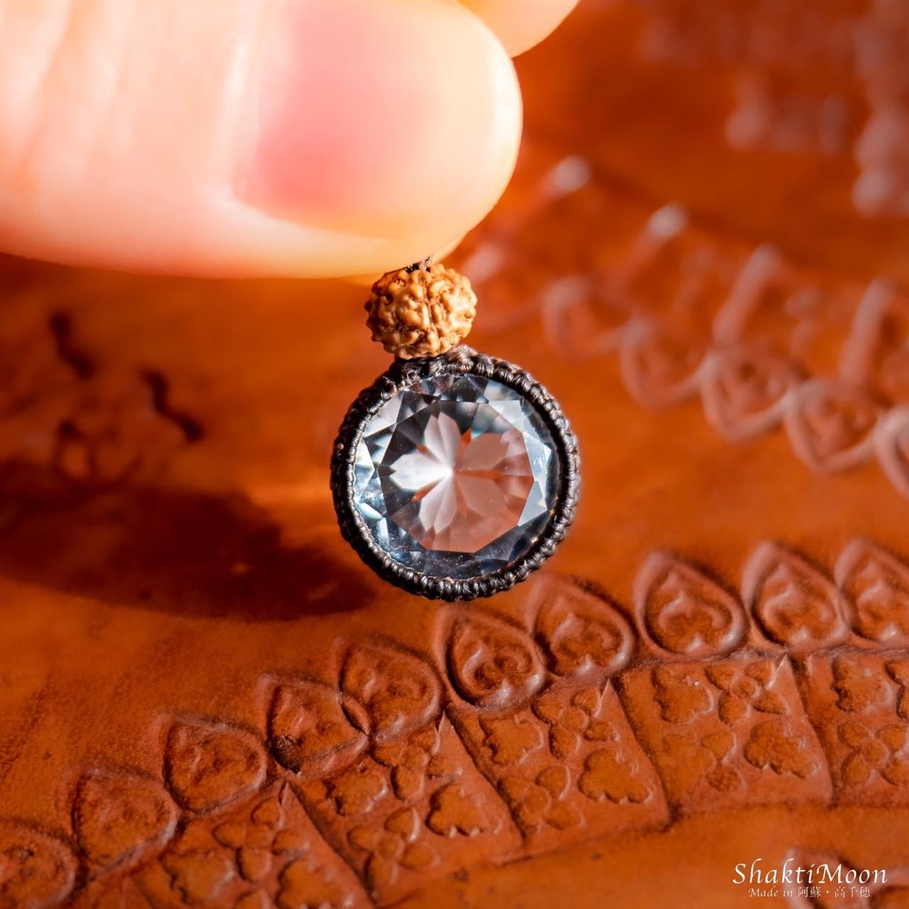 水晶の上にルドラクシャをひと粒組み合わせ、後ろからも持ち主様をお守りしてくれるように紐のエンド部分に2粒ずつルドラクシャをお付けいたしました!