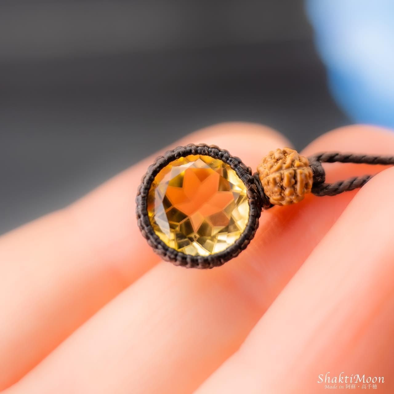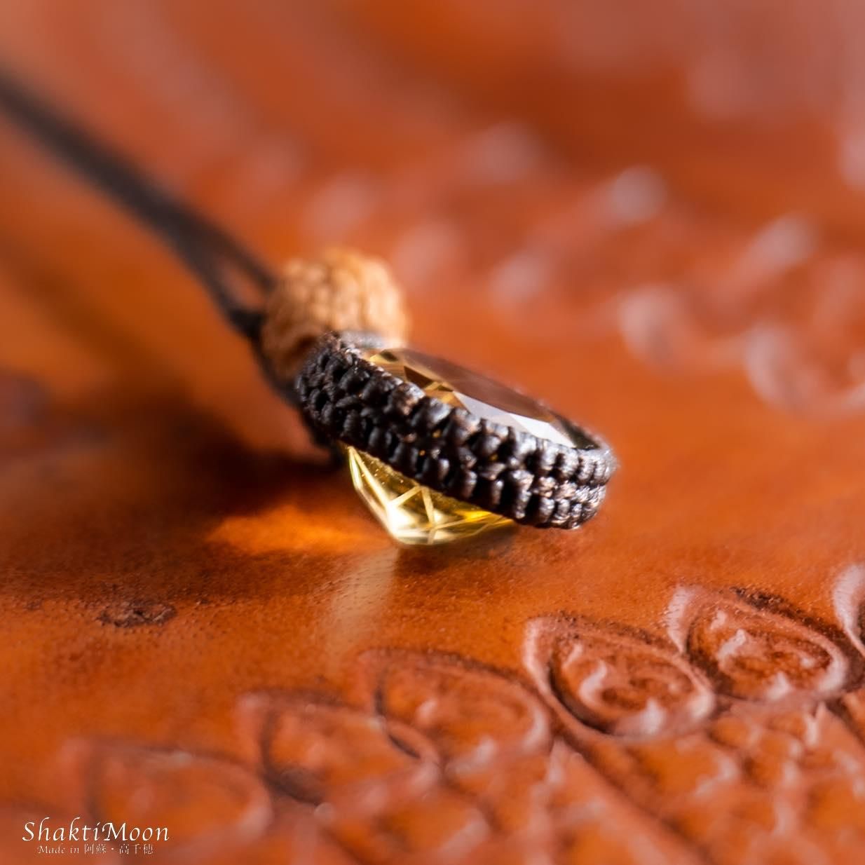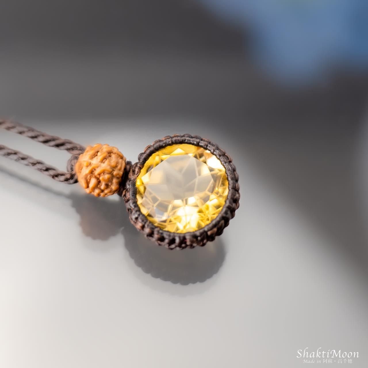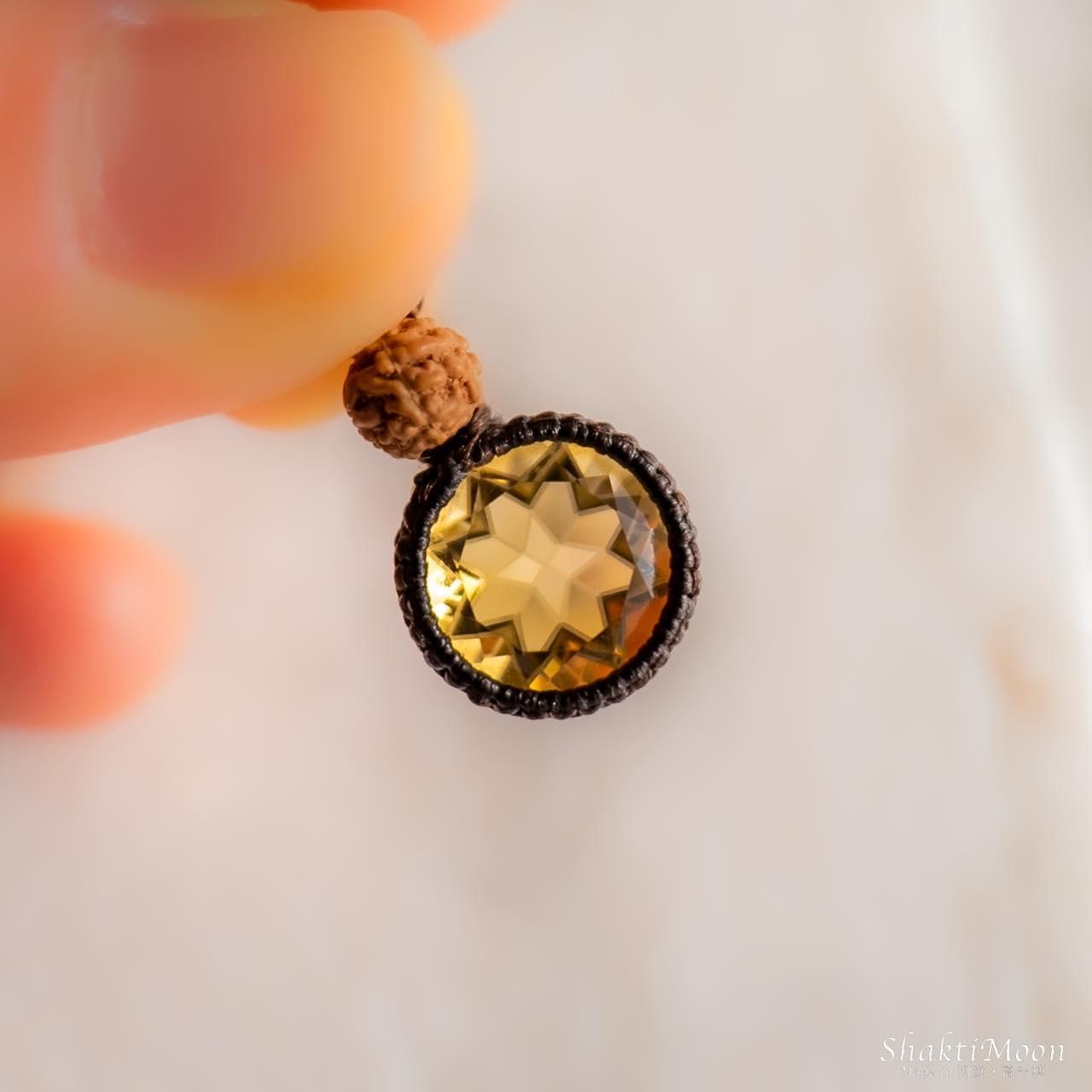 シトリンの上にルドラクシャをひと粒組み合わせ、後ろからも持ち主様をお守りしてくれるように紐のエンド部分に2粒ずつルドラクシャをお付けいたしました!