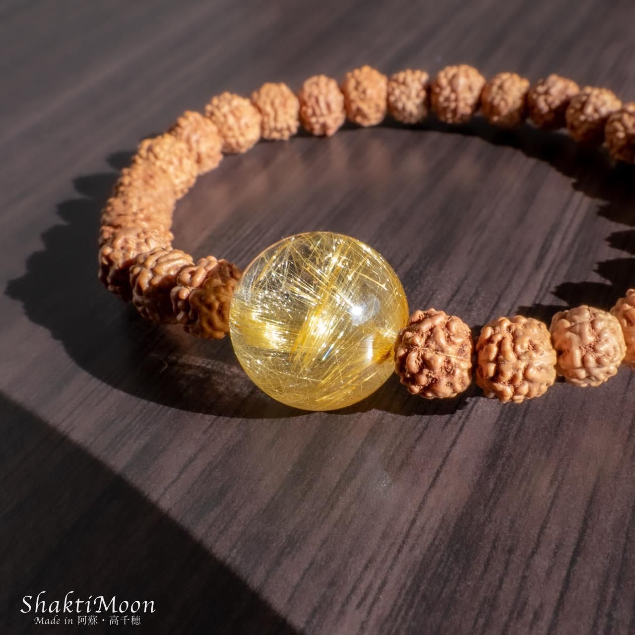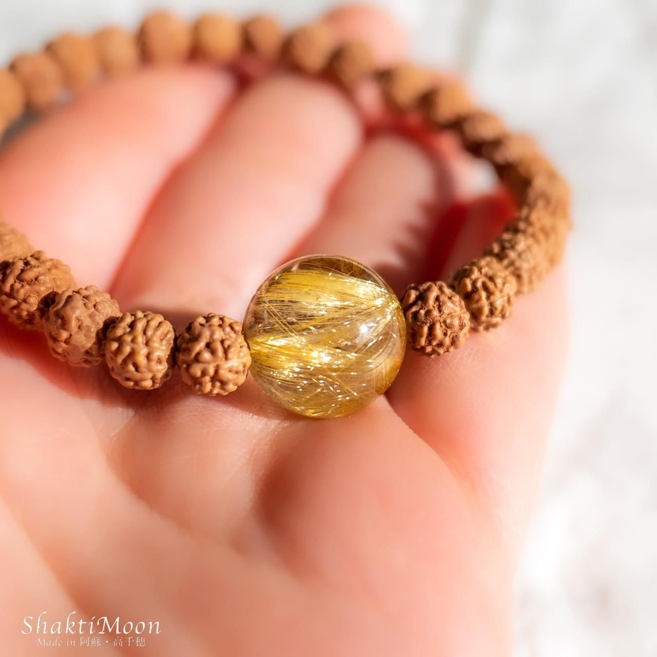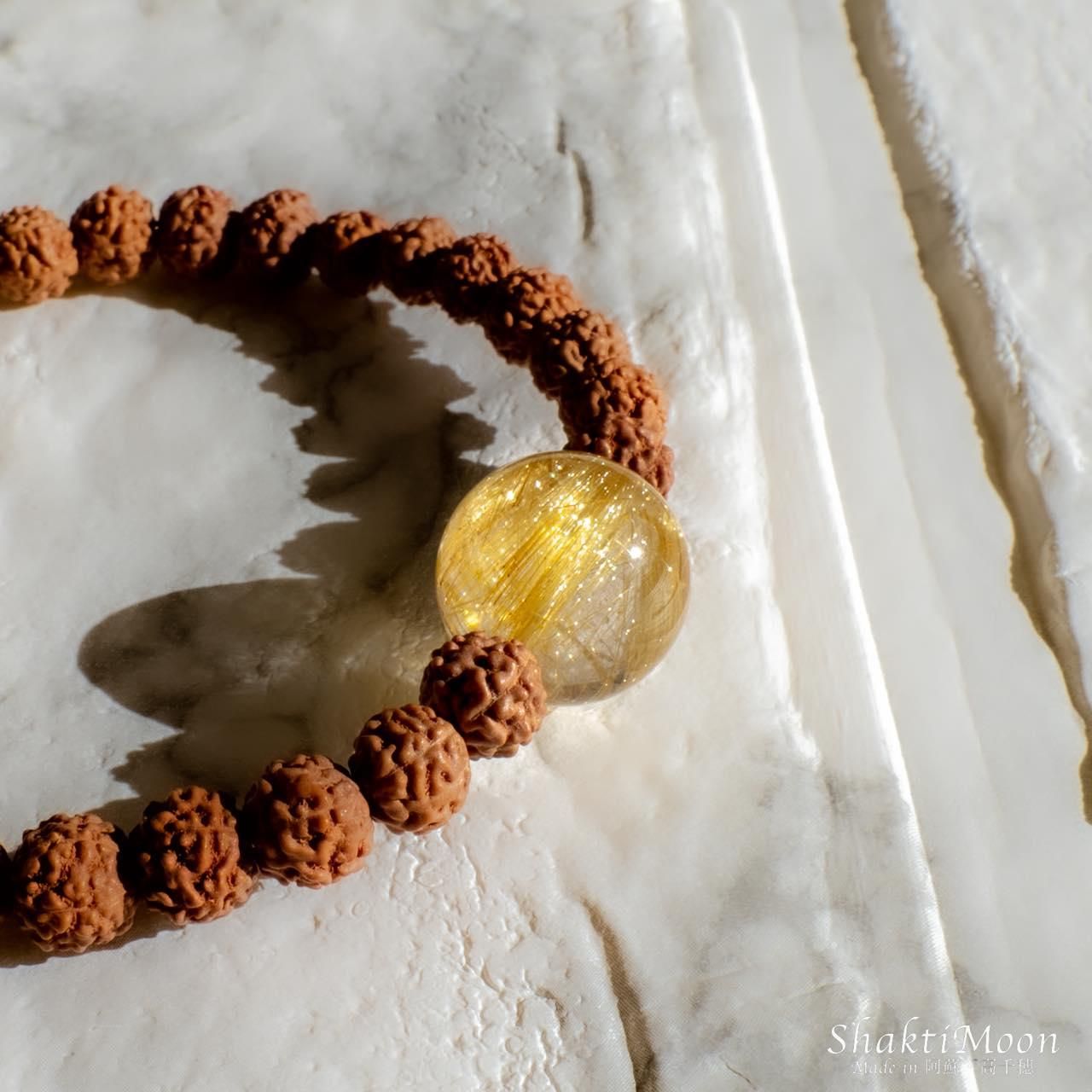 13mmUPの大粒タイチンルチルクォーツと貴重な小粒ルドラクシャを組み合わせた開運・魔除け・お守り・邪気払いとして世代・国境を越えて愛されている神聖な菩提樹の実-ルドラクシャブレスレットです。