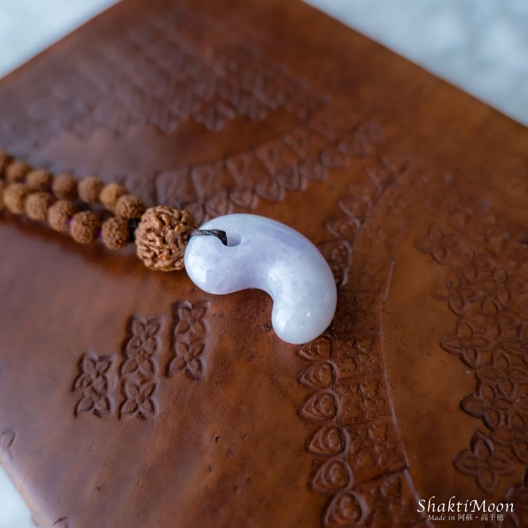 マーラー部分には高品質ルドラクシャを使い、淡いラベンダー色の美しいミャンマー産翡翠の勾玉と組み合わせました。