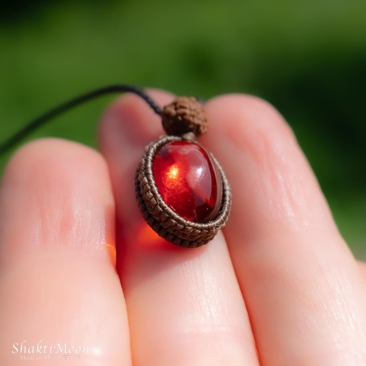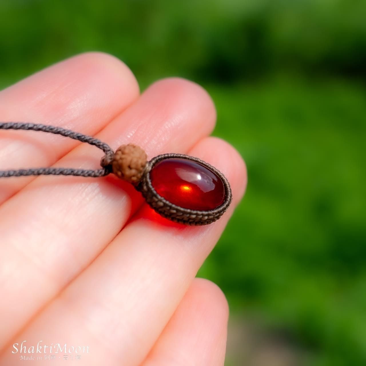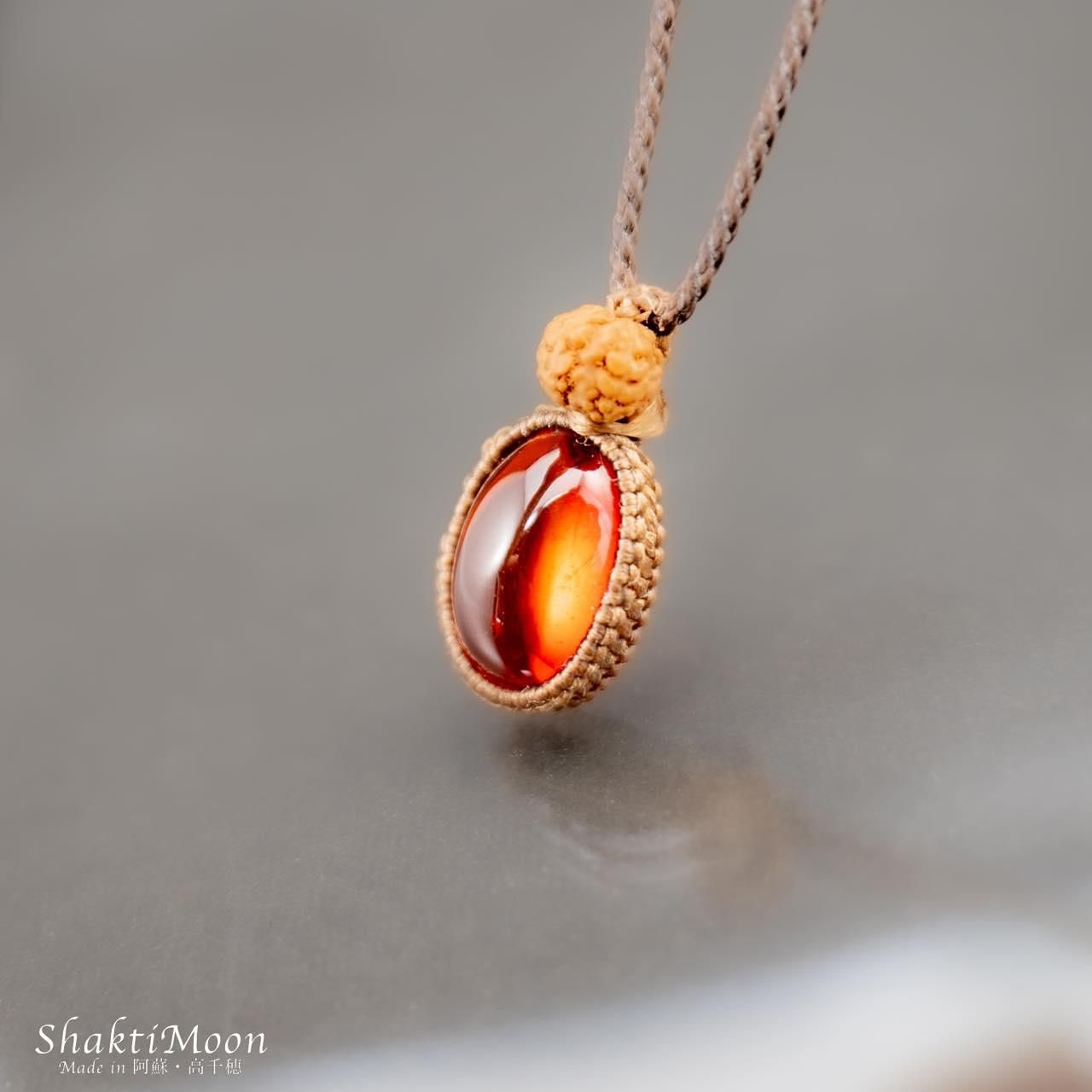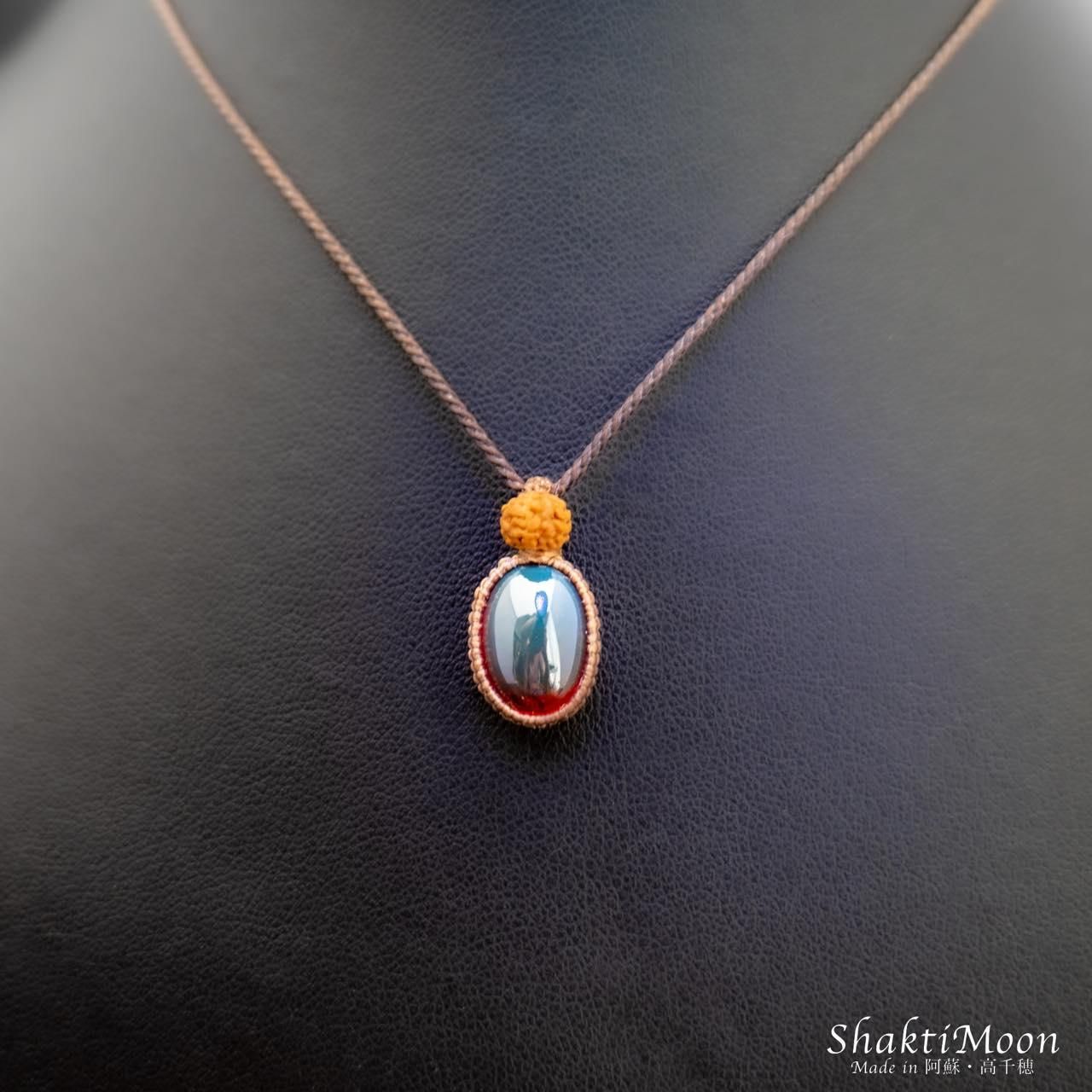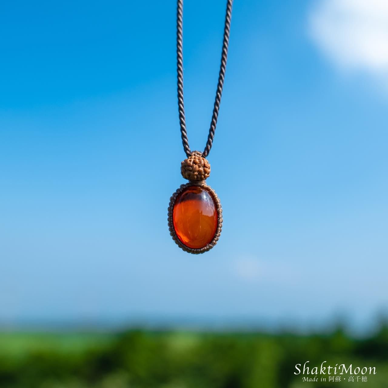 レッドアンバーの上にルドラクシャをひと粒組み合わせ、後ろからも持ち主様をお守りしてくれるように紐のエンド部分に2粒ずつルドラクシャをお付けいたしました!