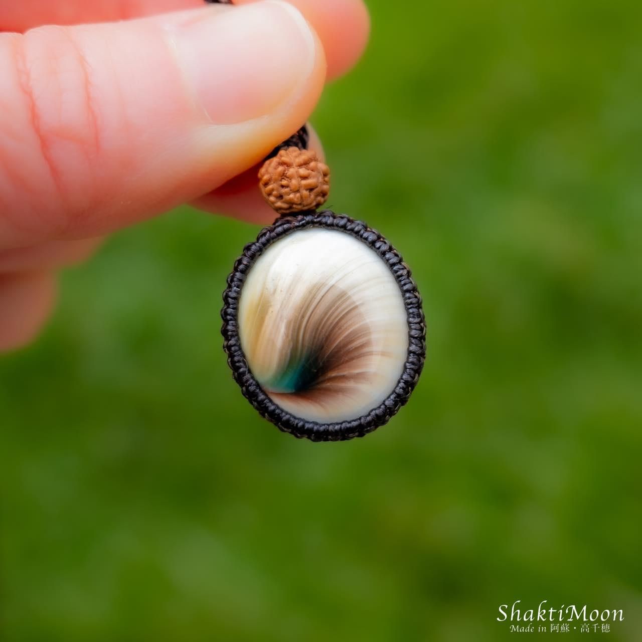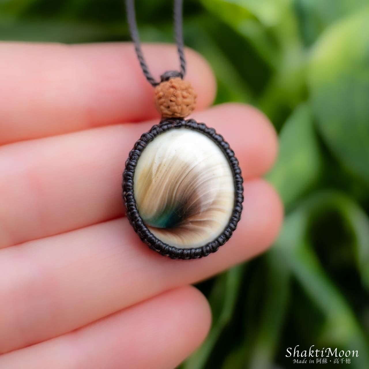 シヴァアイの上にルドラクシャをひと粒組み合わせ、後ろからも持ち主様をお守りしてくれるように紐のエンド部分に2粒ずつルドラクシャをお付けいたしました!