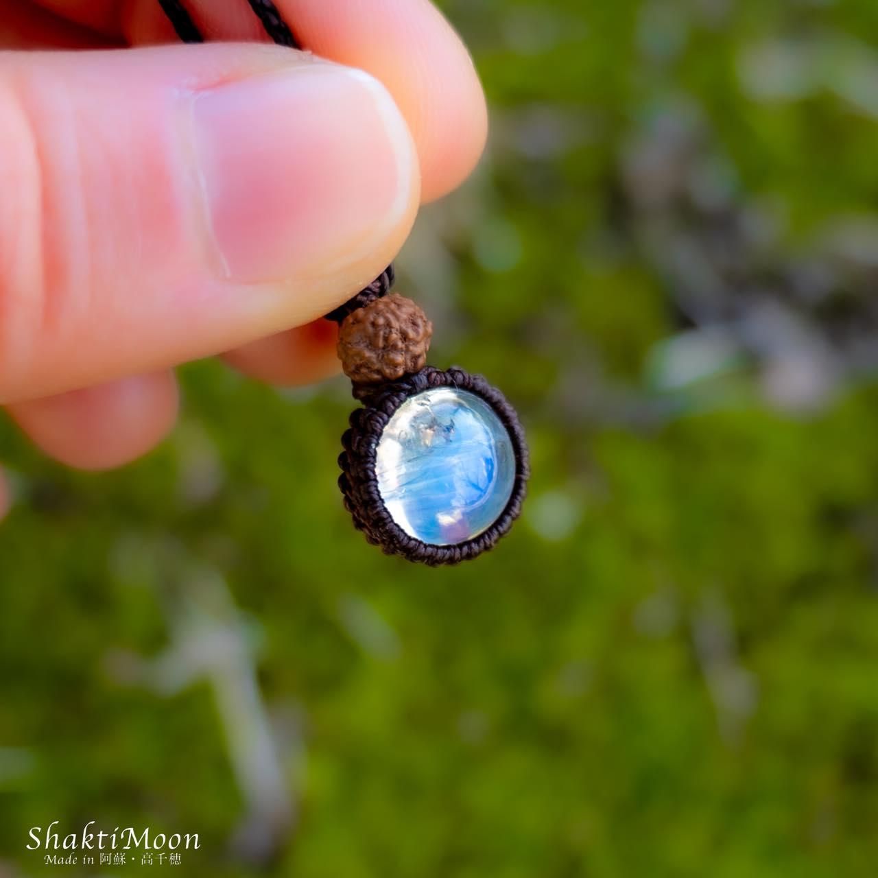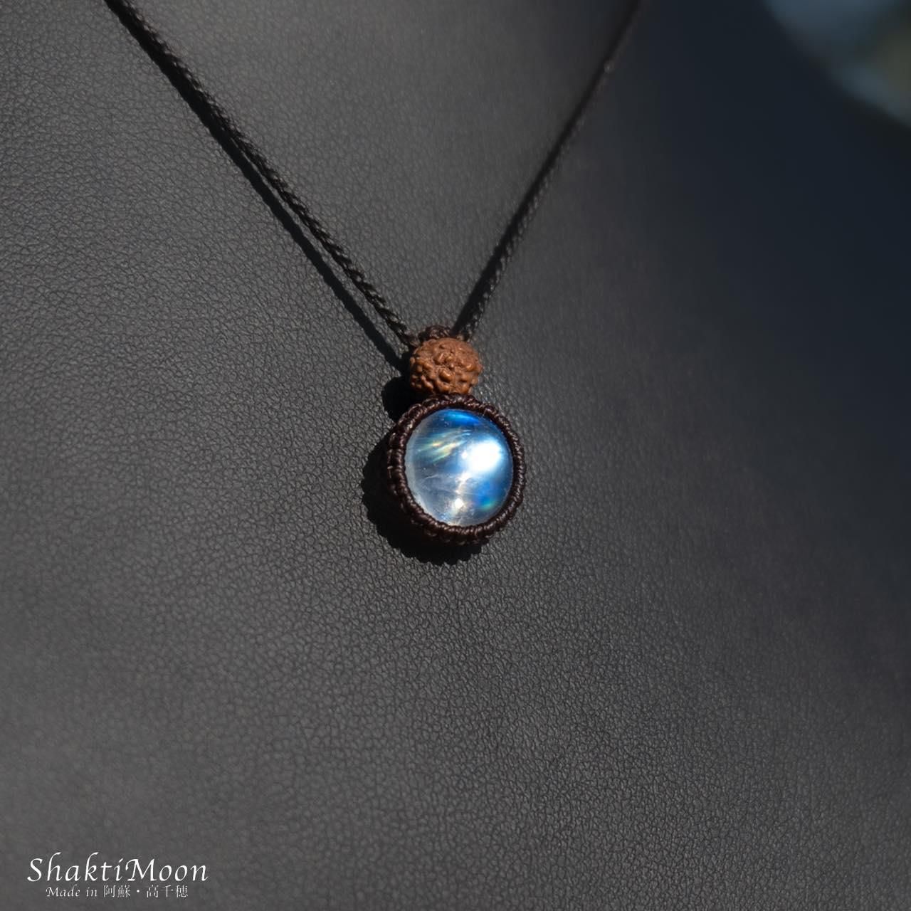 ムーンストーンの上にルドラクシャをひと粒組み合わせ、後ろからも持ち主様をお守りしてくれるように紐のエンド部分に2粒ずつルドラクシャをお付けいたしました!