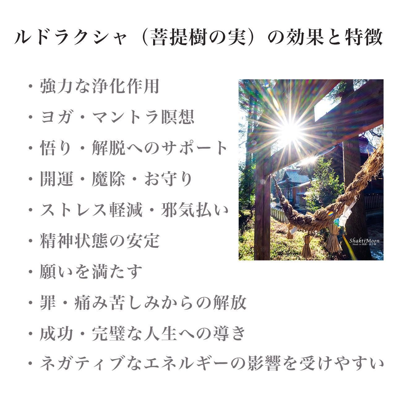 また、ルドラクシャ(菩提樹の実)は天然の木の実のため、形状やサイズに多少のばらつきがございます。
