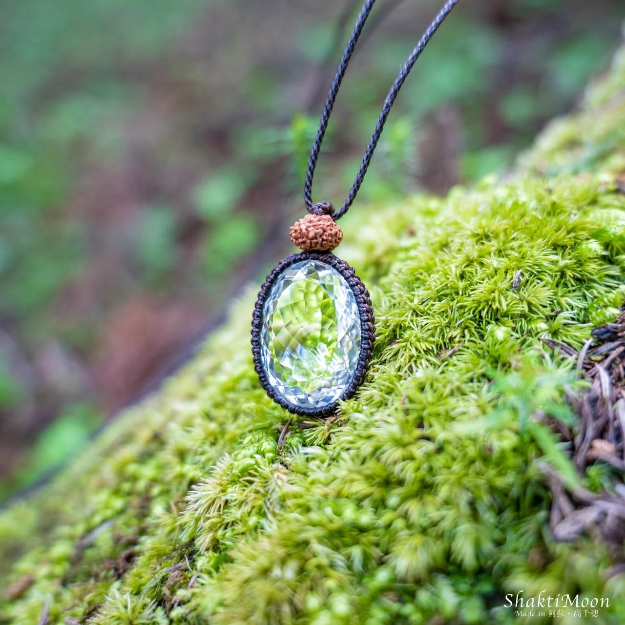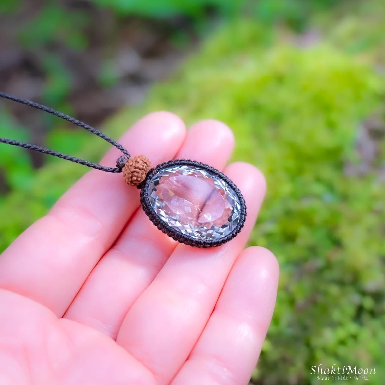 プレミアムカット水晶の上に9面ルドラクシャをひと粒組み合わせ、後ろからも持ち主様をお守りしてくれるように紐のエンド部分に2粒ずつ5面ルドラクシャをお付けいたしました!