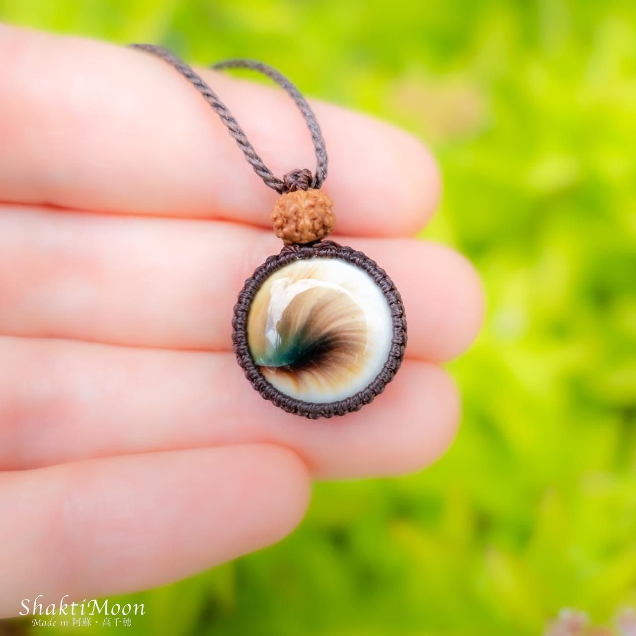 シヴァアイの上にルドラクシャをひと粒組み合わせ、後ろからも持ち主様をお守りしてくれるように紐のエンド部分に2粒ずつルドラクシャをお付けいたしました!