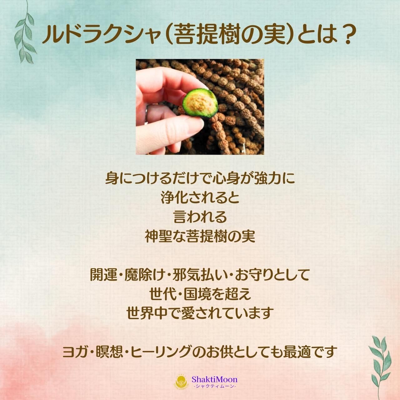 また、ルドラクシャ(菩提樹の実)は天然の木の実のため、形状やサイズに多少のばらつきがございます。