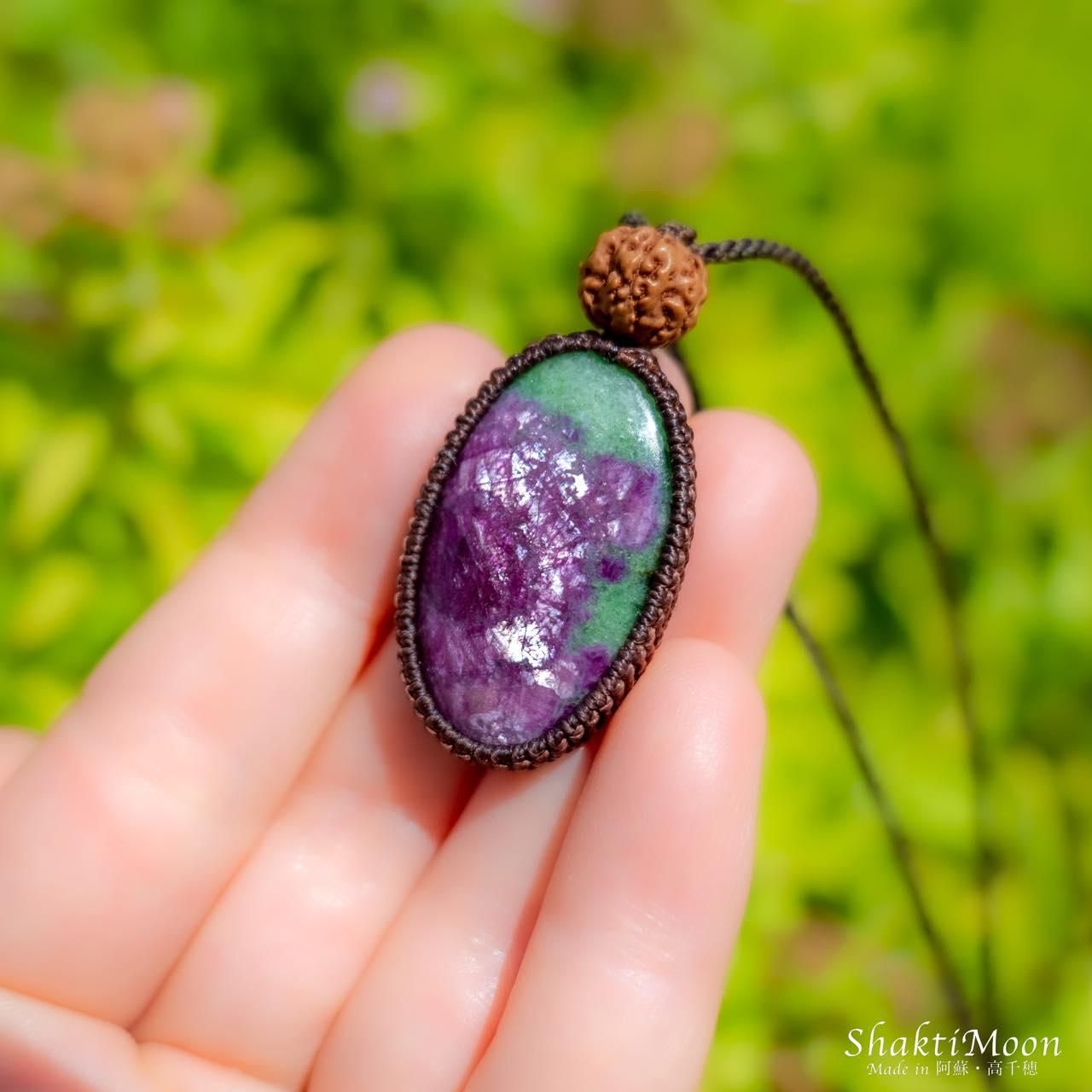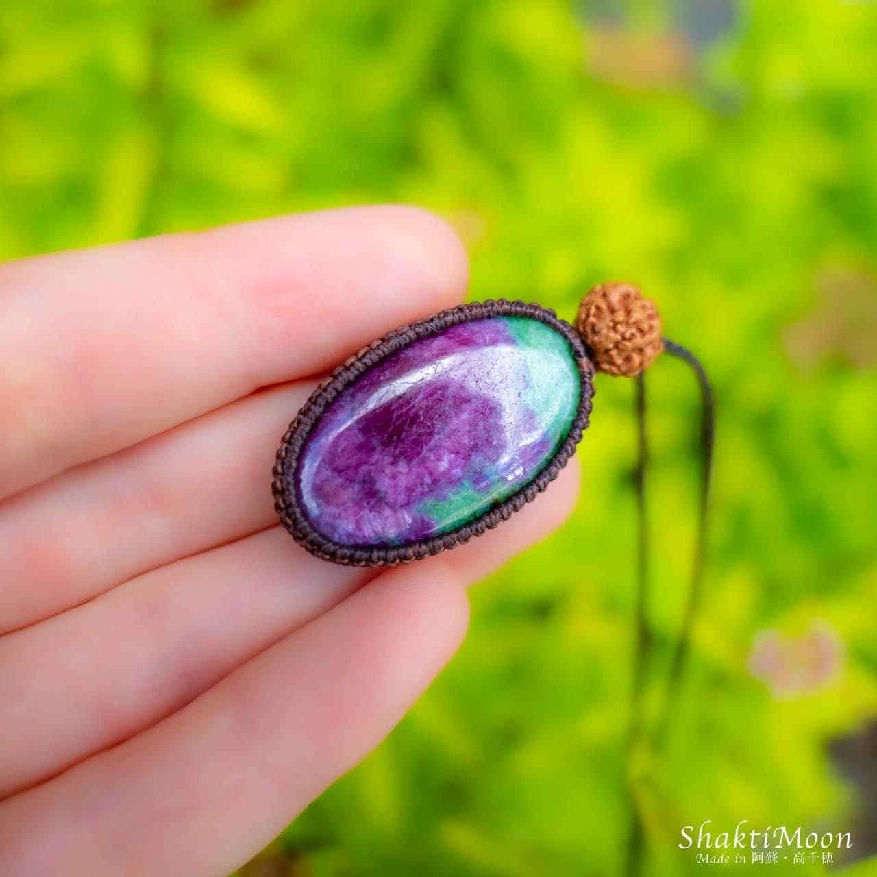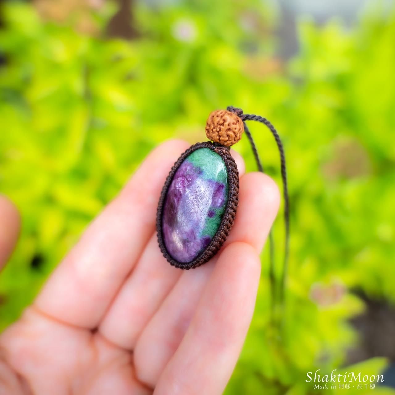 ルビーインゾイサイトの上にルドラクシャをひと粒組み合わせ、後ろからも持ち主様をお守りしてくれるように紐のエンド部分に2粒ずつルドラクシャをお付けいたしました!