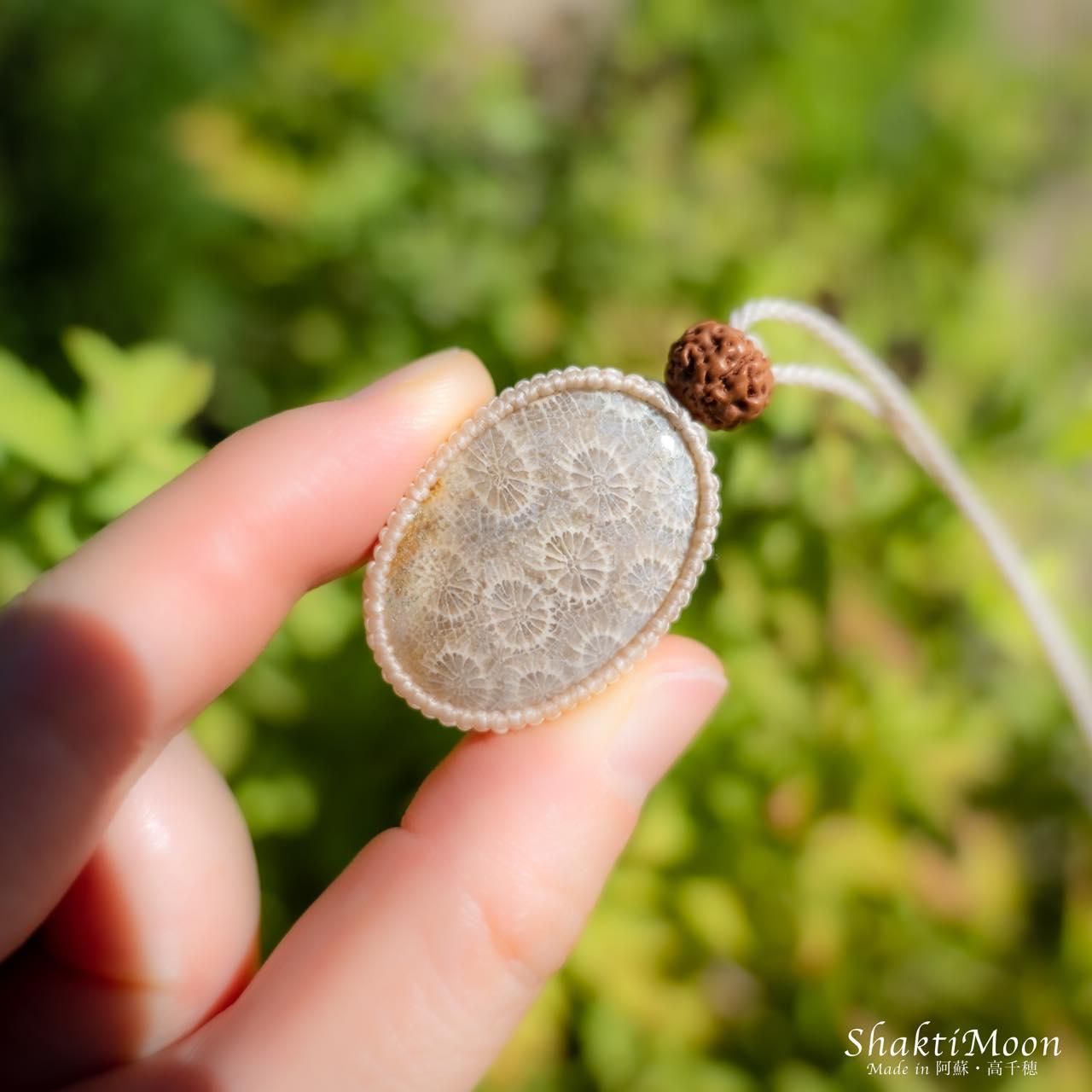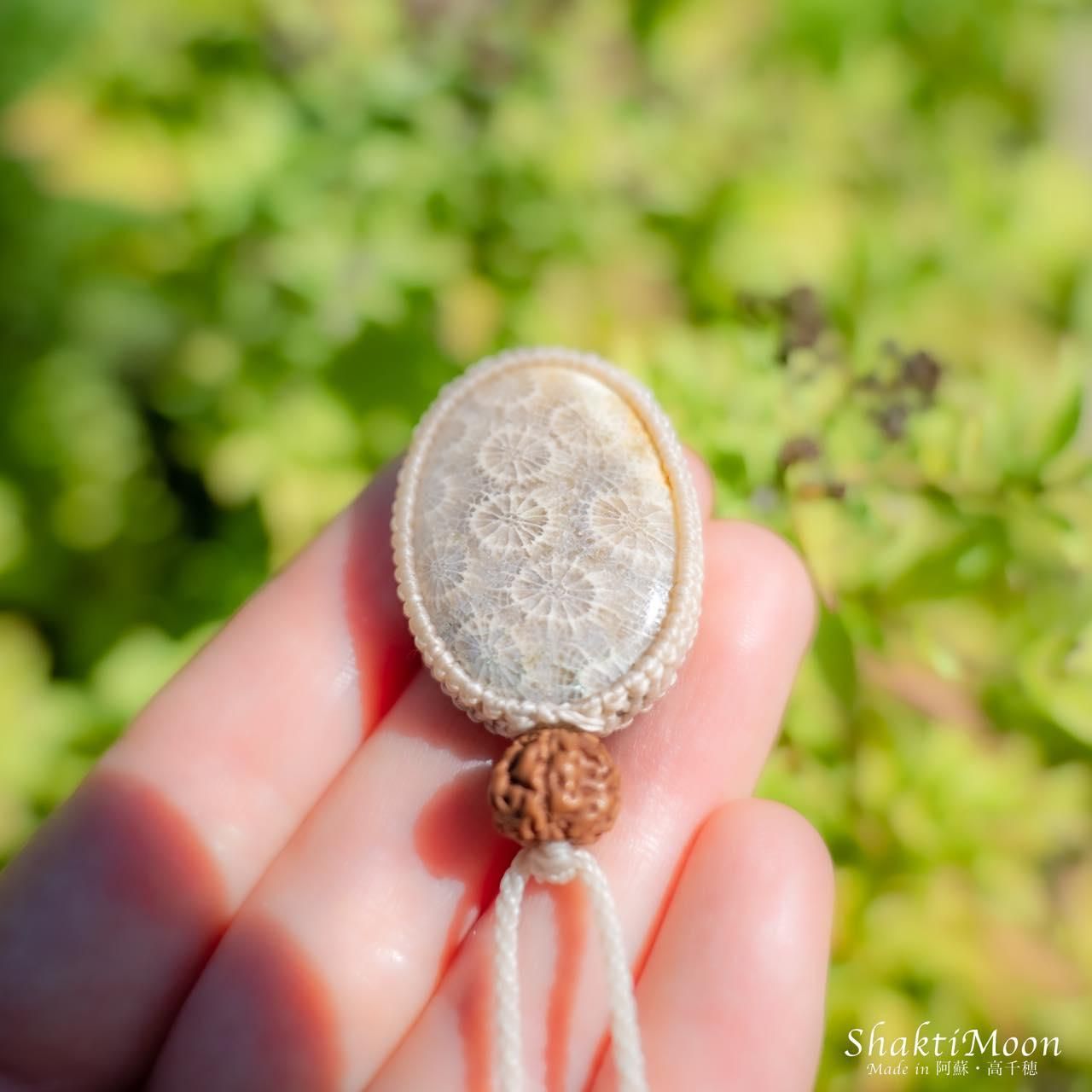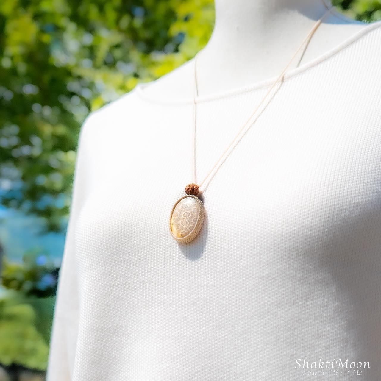 【新たな未来を歩みたいあなたへ!フォッシルコーラル(化石珊瑚)とルドラクシャのお守りネックレス4】天然石マクラメネックレス ペンダント 第1チャクラ対応