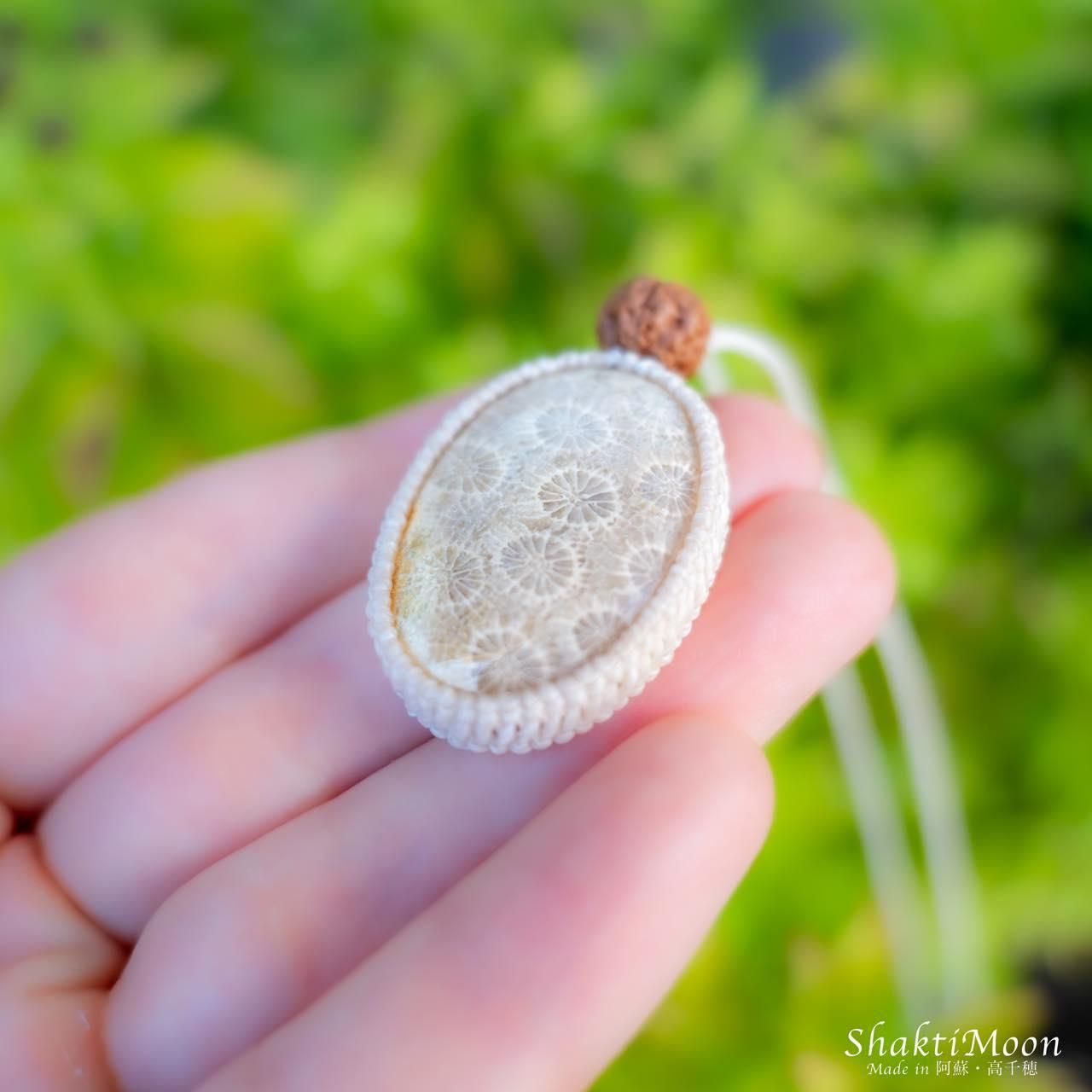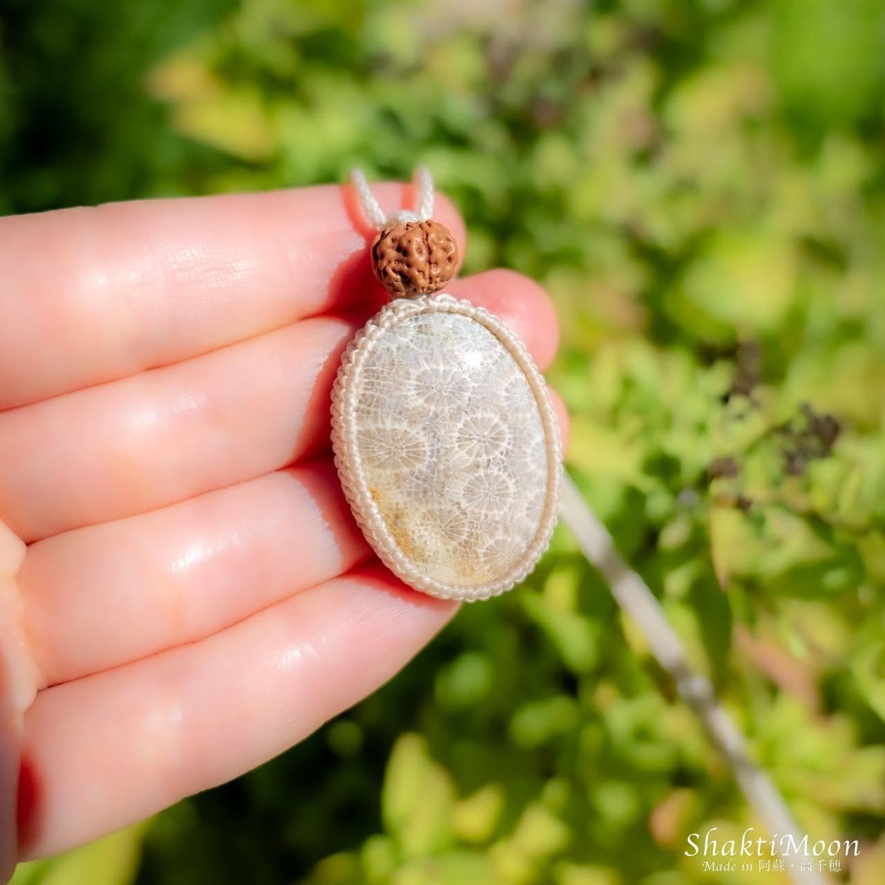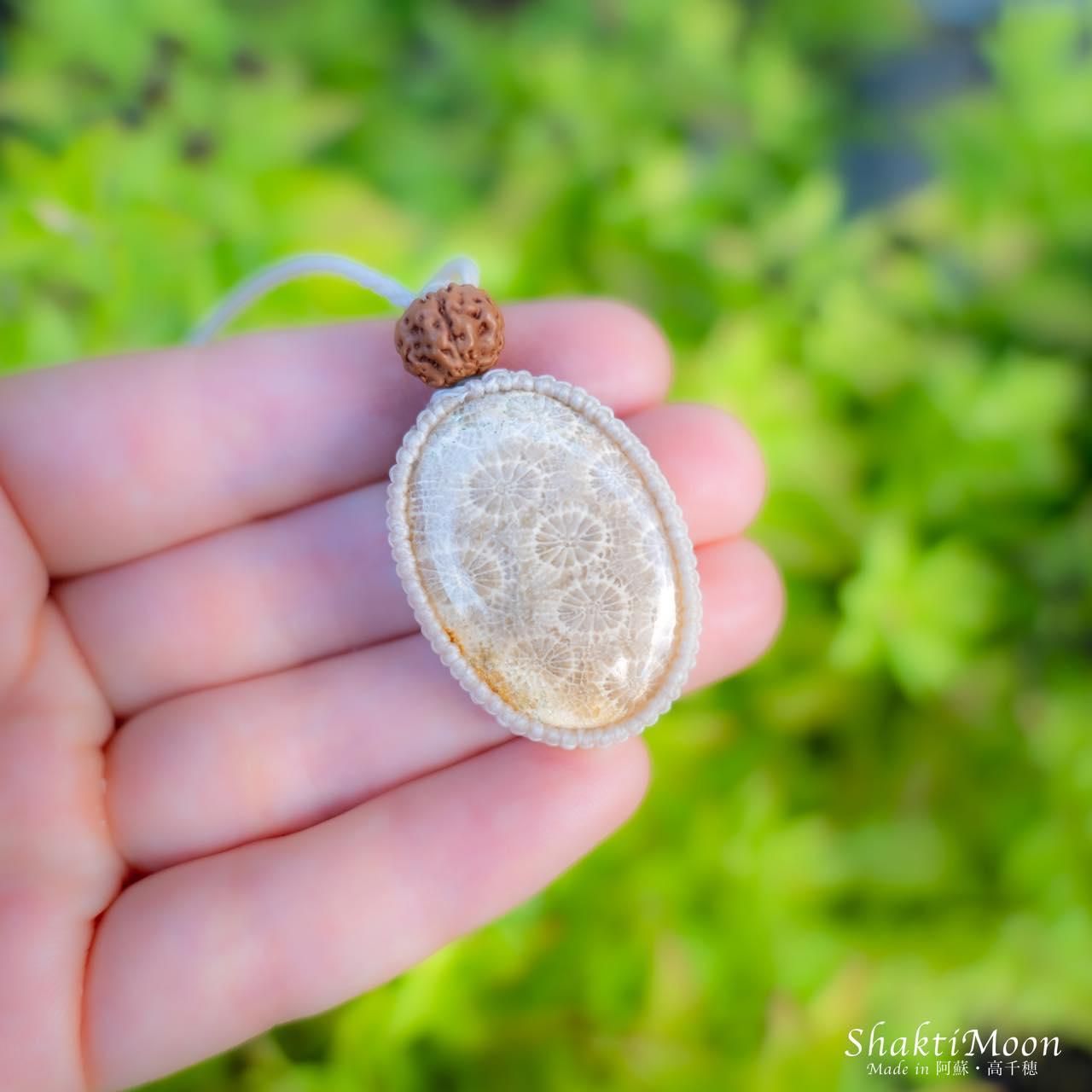 【新たな未来を歩みたいあなたへ!フォッシルコーラル(化石珊瑚)とルドラクシャのお守りネックレス4】天然石マクラメネックレス ペンダント 第1チャクラ対応