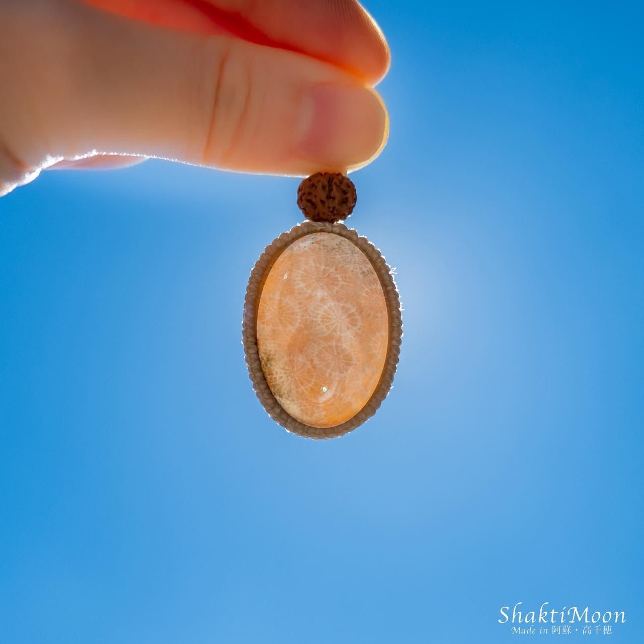 フォッシルコーラルの上にルドラクシャをひと粒組み合わせ、後ろからも持ち主様をお守りしてくれるように紐のエンド部分にも2粒ずつルドラクシャをお付けいたしました!