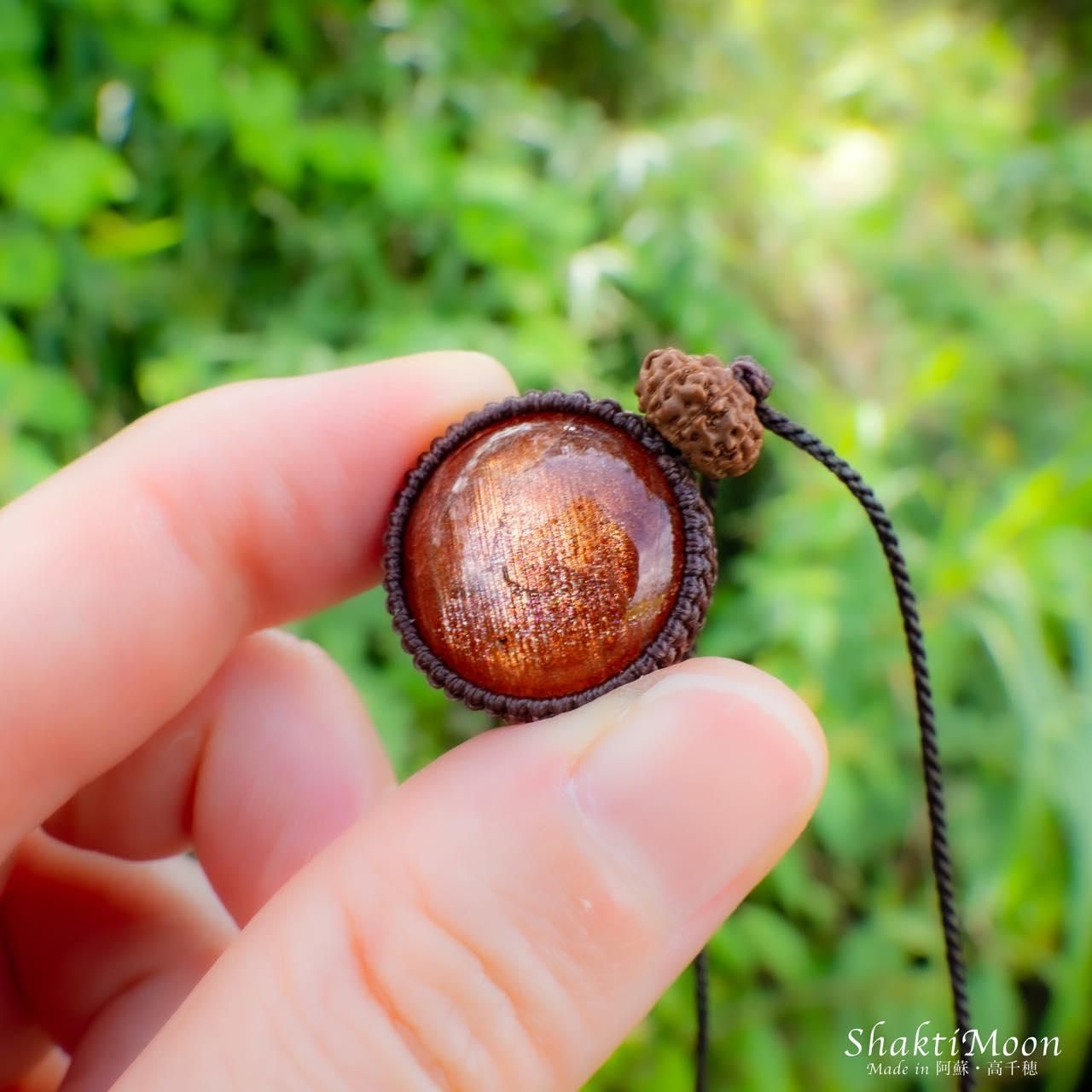 サンストーンの上に9面ルドラクシャをひと粒組み合わせ、後ろからも持ち主様をお守りしてくれるように紐のエンド部分に2粒ずつ5面ルドラクシャをお付けいたしました!
