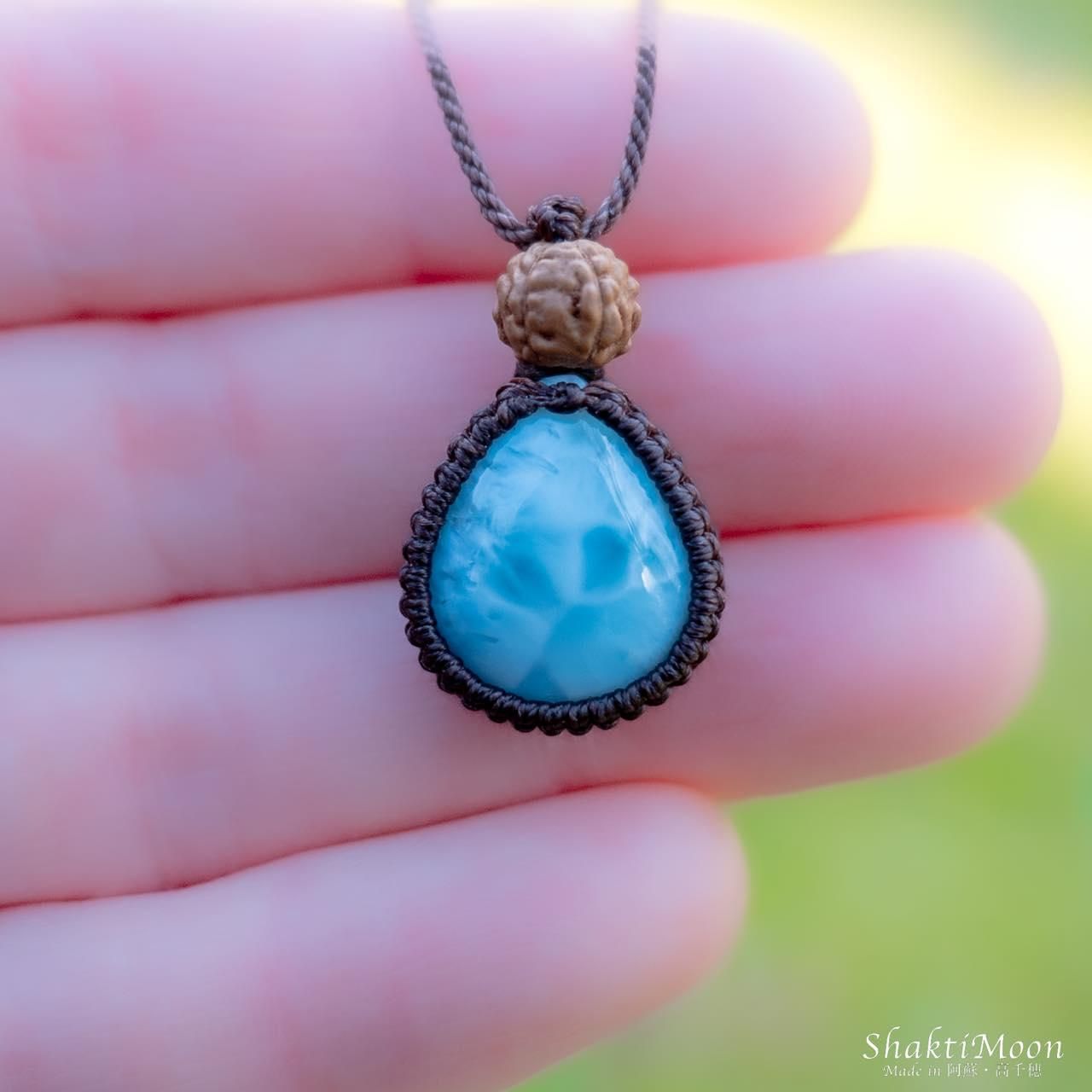 ラリマーの上にルドラクシャをひと粒組み合わせ、後ろからも持ち主様をお守りしてくれるように紐のエンド部分に2粒ずつルドラクシャをお付けいたしました!