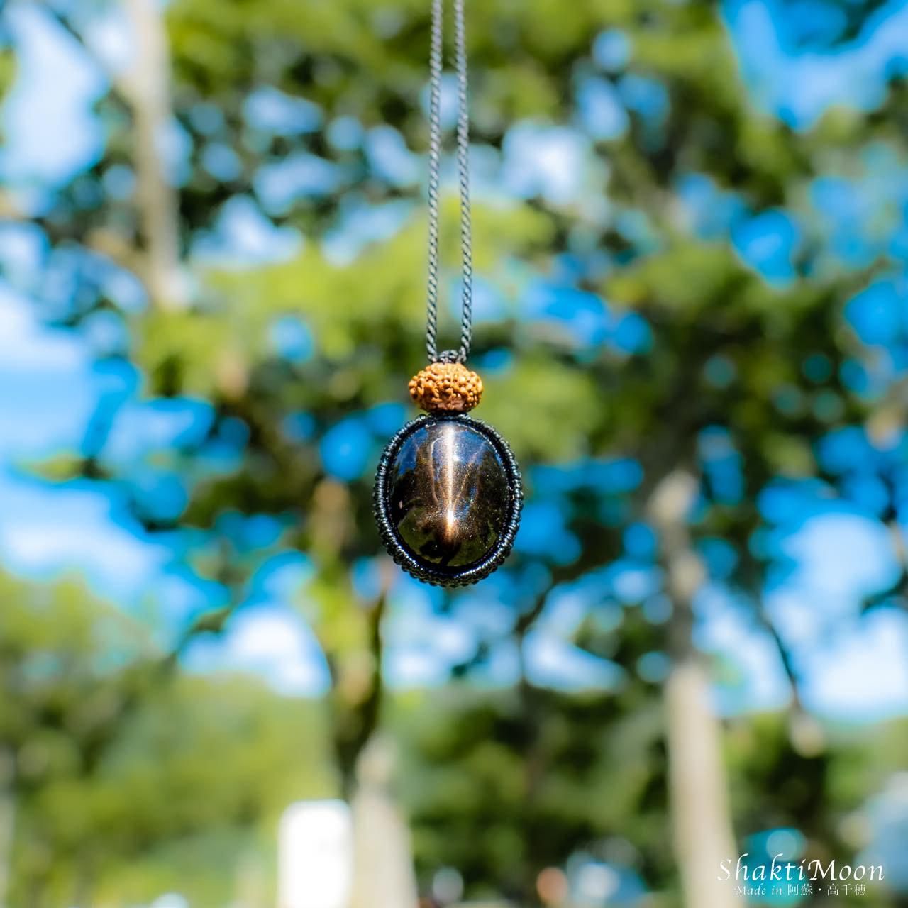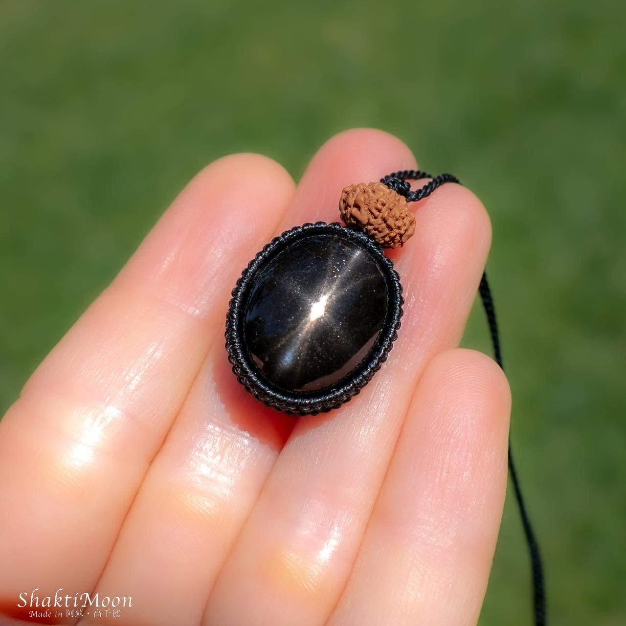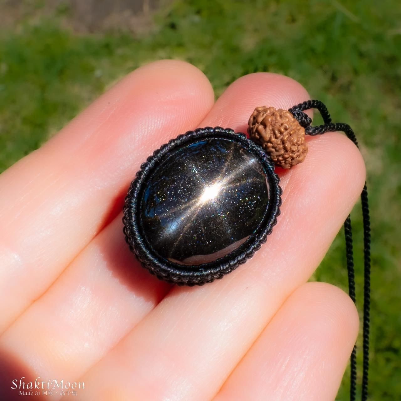 *写真のブラックスターサンストーンを使ったルドラクシャマーラーペンダントです。