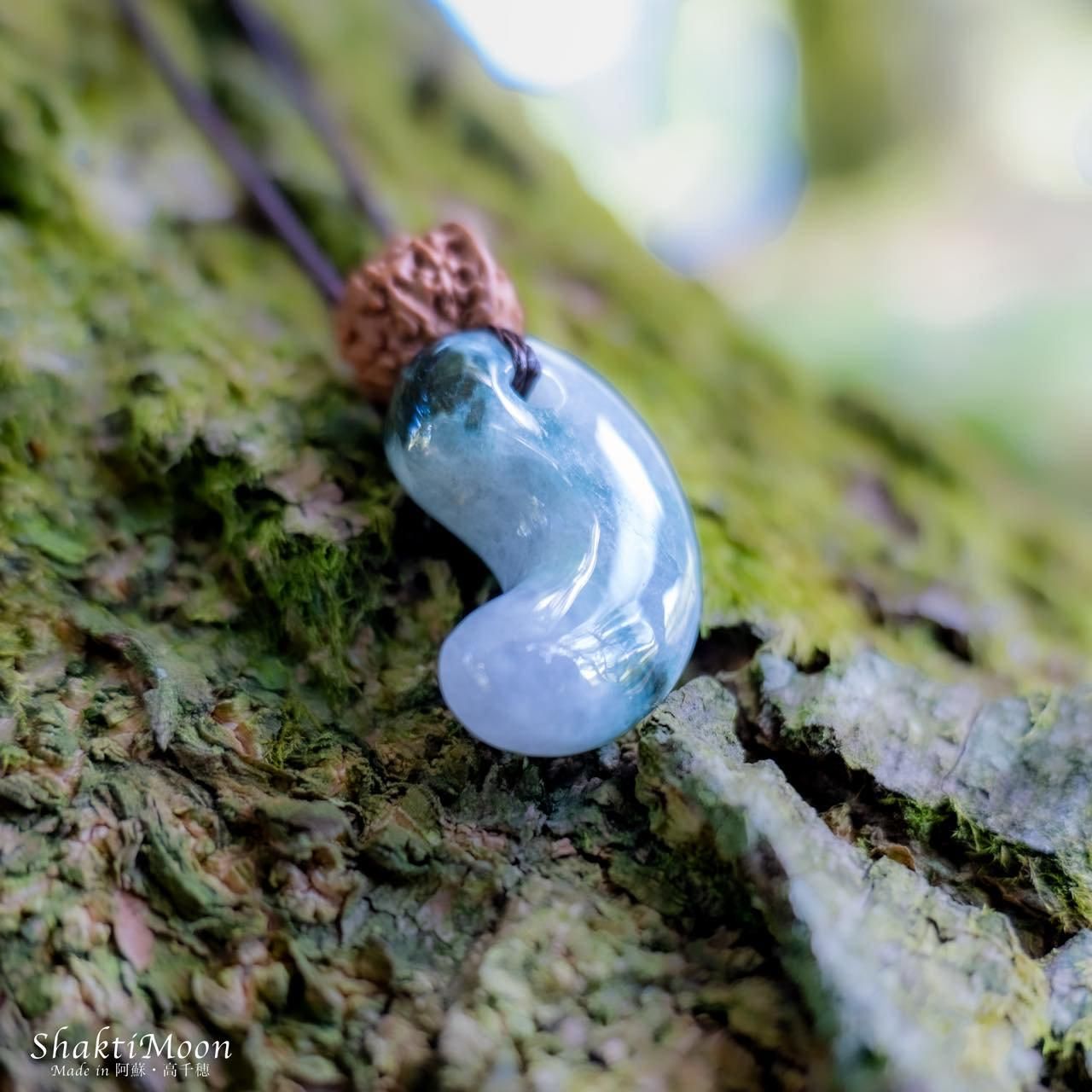 翡翠勾玉の上のルドラクシャはガネーシャ神のお鼻のように一部に突起物があることから、ガネーシャルドラクシャと呼ばれ、大変縁起の良いルドラクシャとして重宝されています。