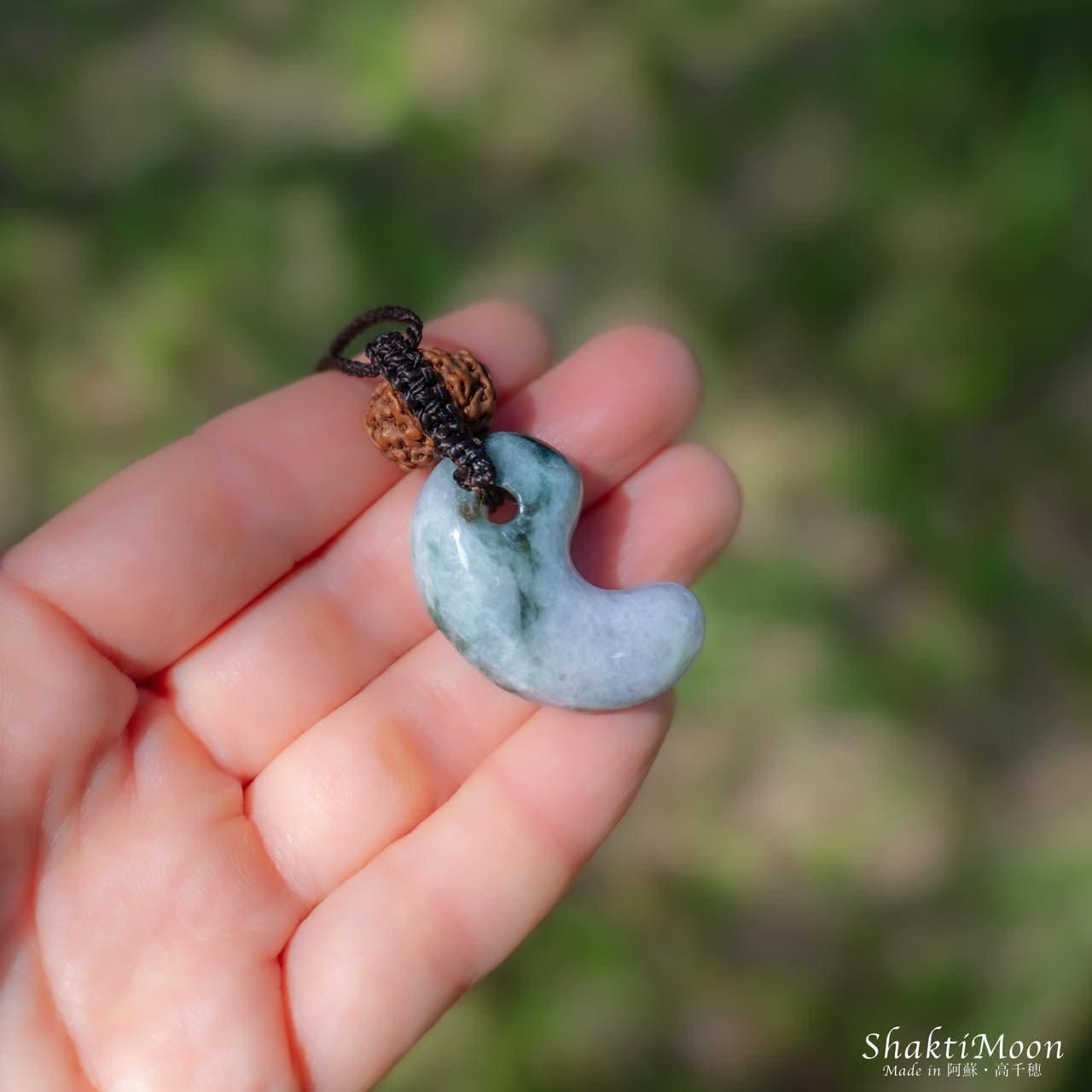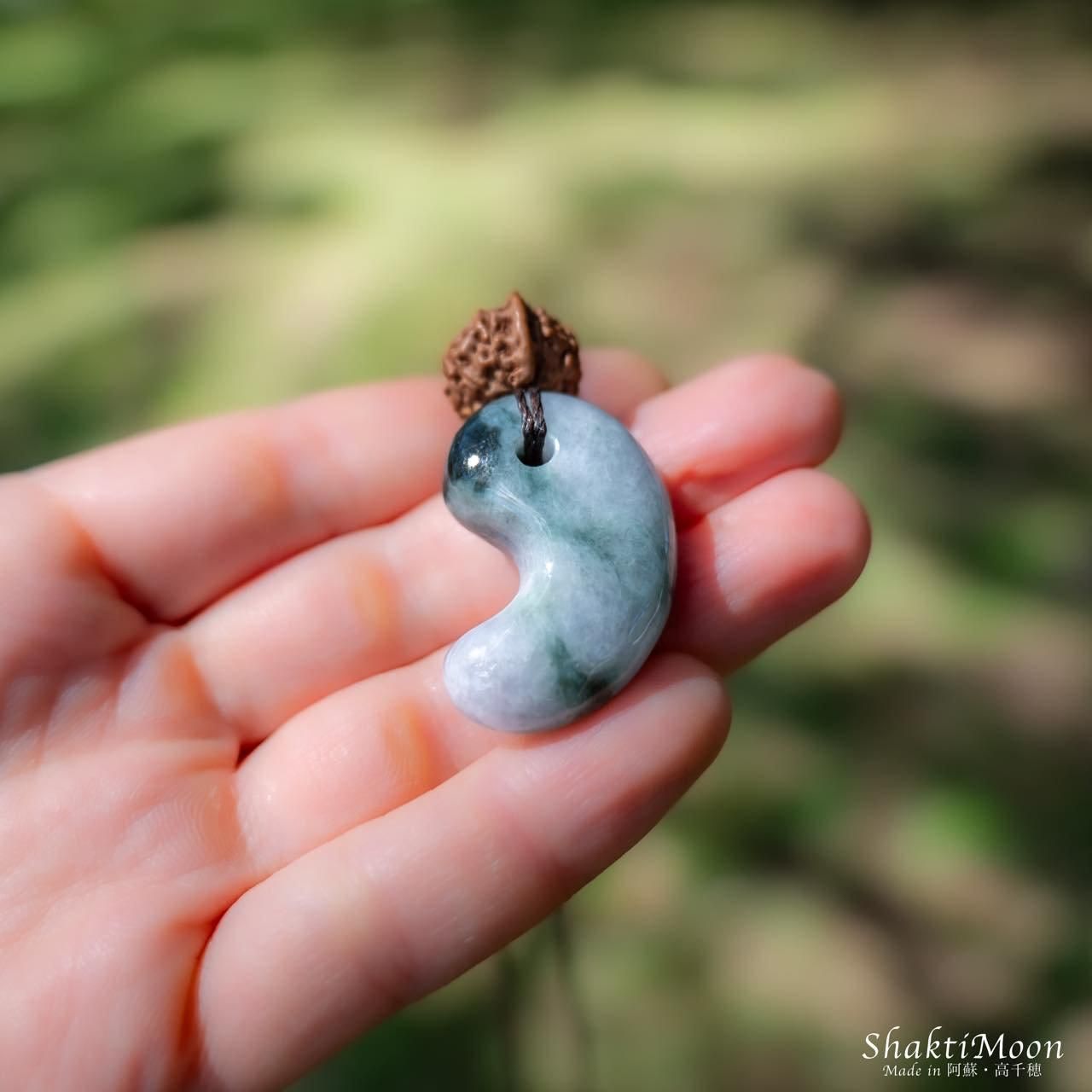 翡翠の勾玉の上にルドラクシャを8面ガネーシャルドラクシャをサービスでひと粒組み合わせ、