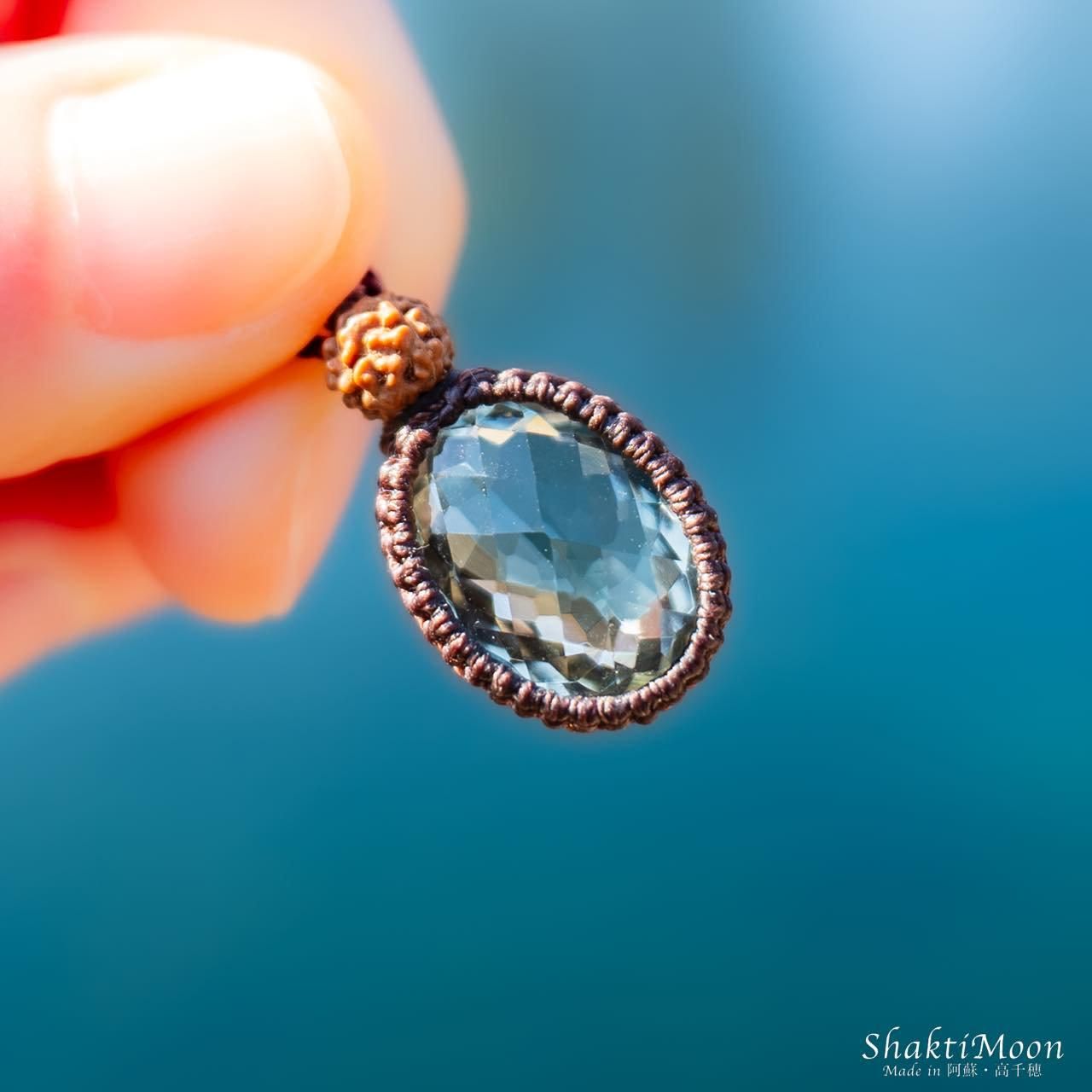 スピリチュアルなパワーが強く精神を安定させ心配事・不安・ストレスを取り除くと言われているグリーンアメジストの上にルドラクシャをひと粒組み合わせ、