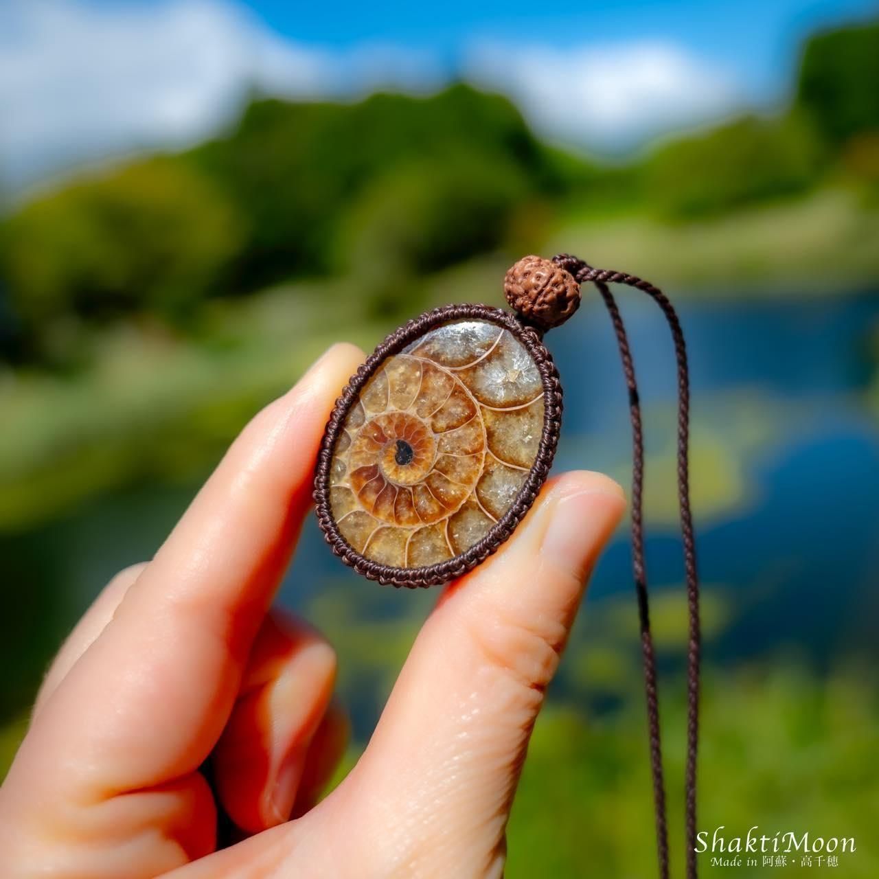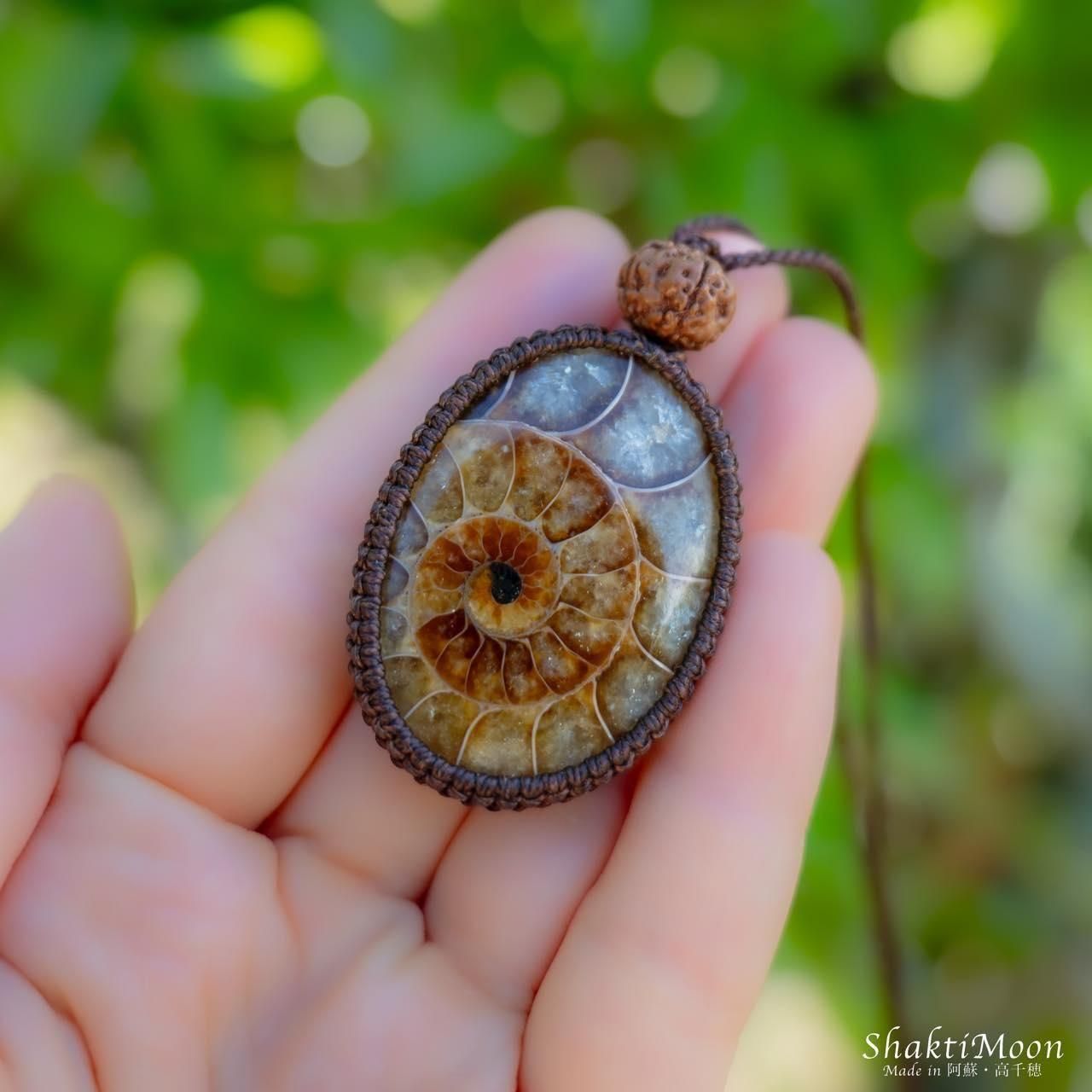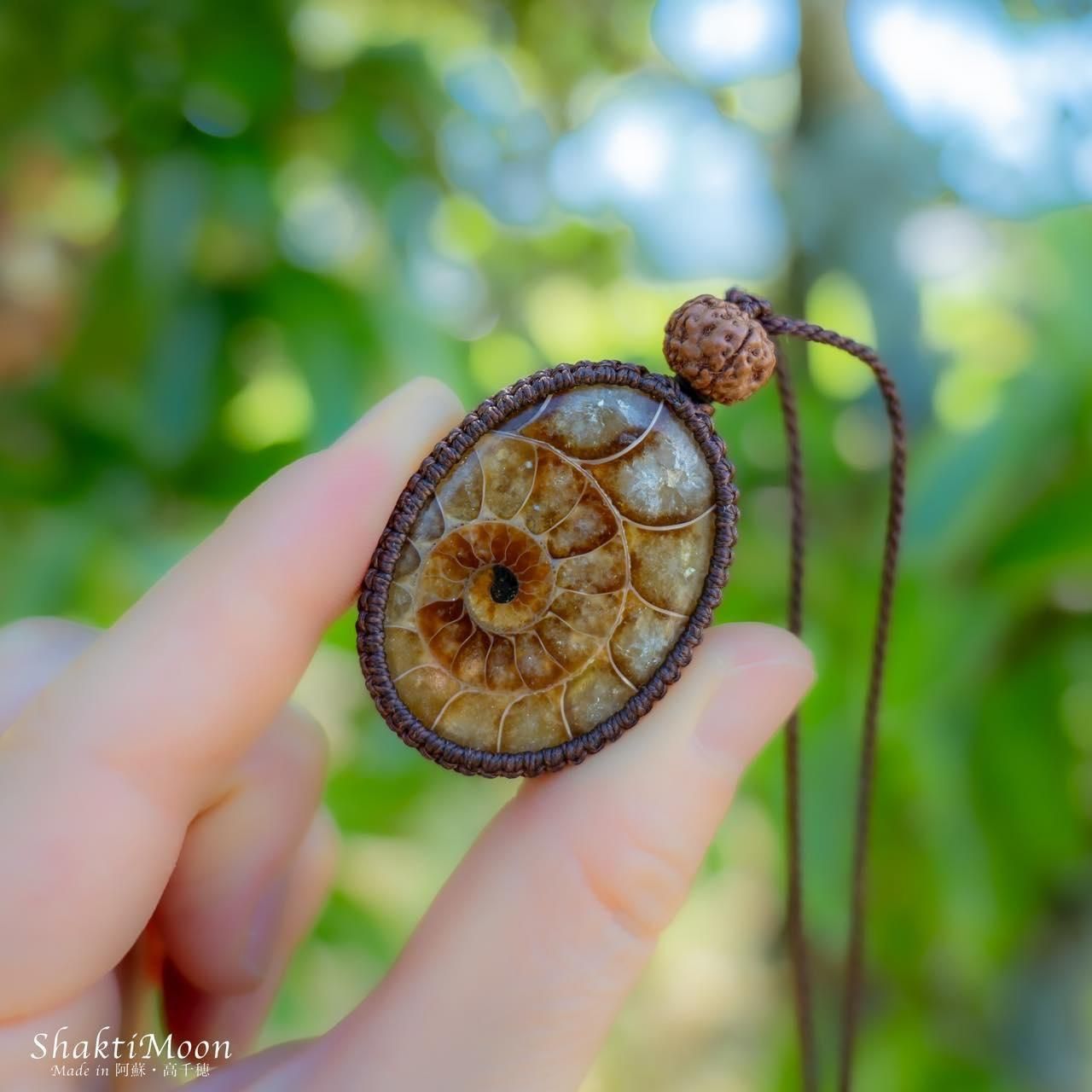 アンモナイトの上にルドラクシャをひと粒組み合わせ、後ろからも持ち主様をお守りしてくれるように紐のエンド部分に2粒ずつルドラクシャをお付けいたしました!