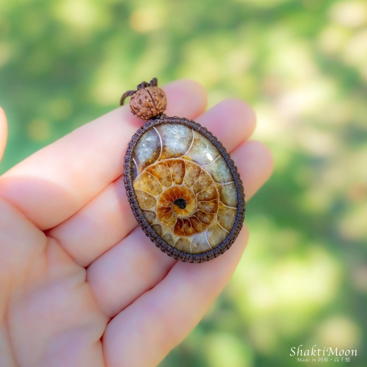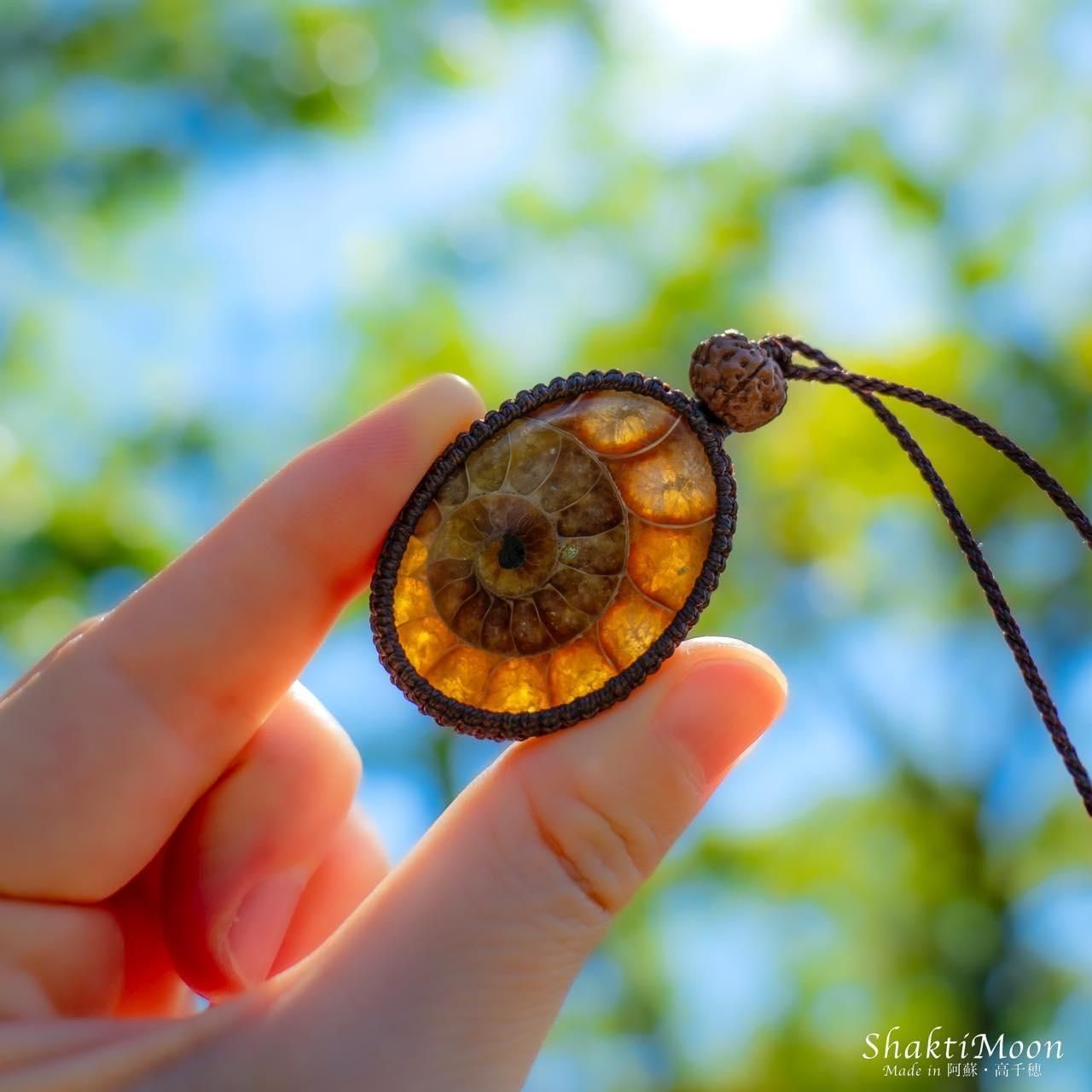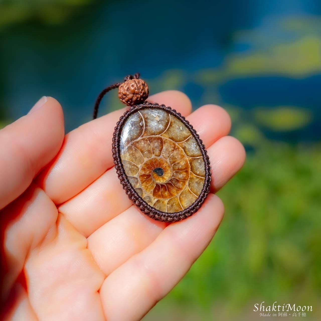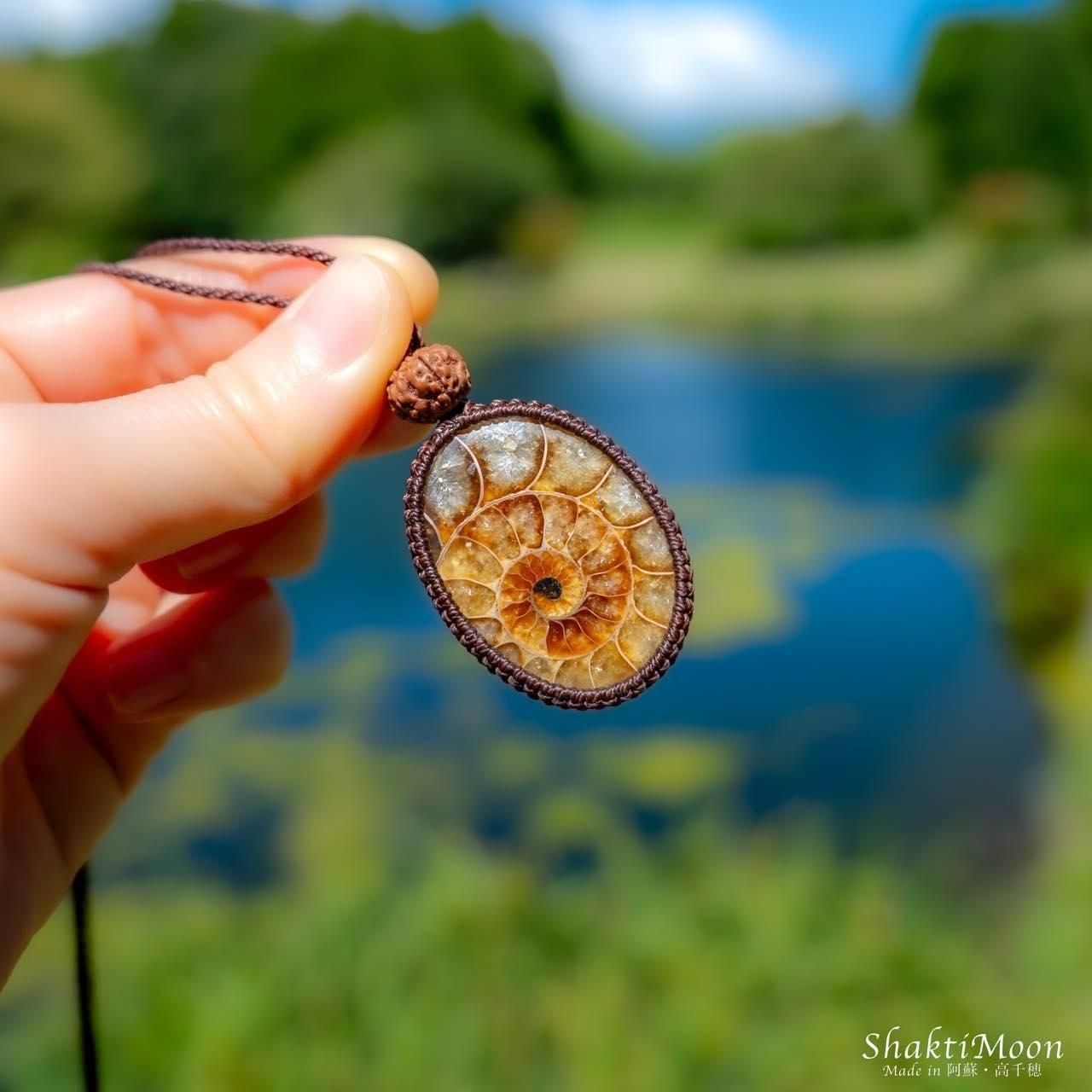 アンモナイトの上にルドラクシャをひと粒組み合わせ、後ろからも持ち主様をお守りしてくれるように紐のエンド部分に2粒ずつルドラクシャをお付けいたしました!