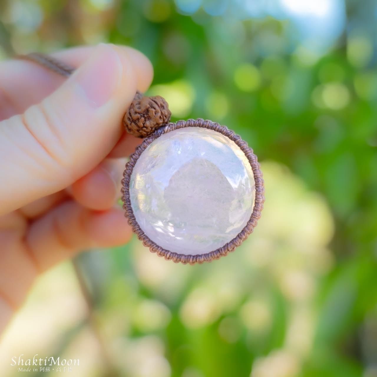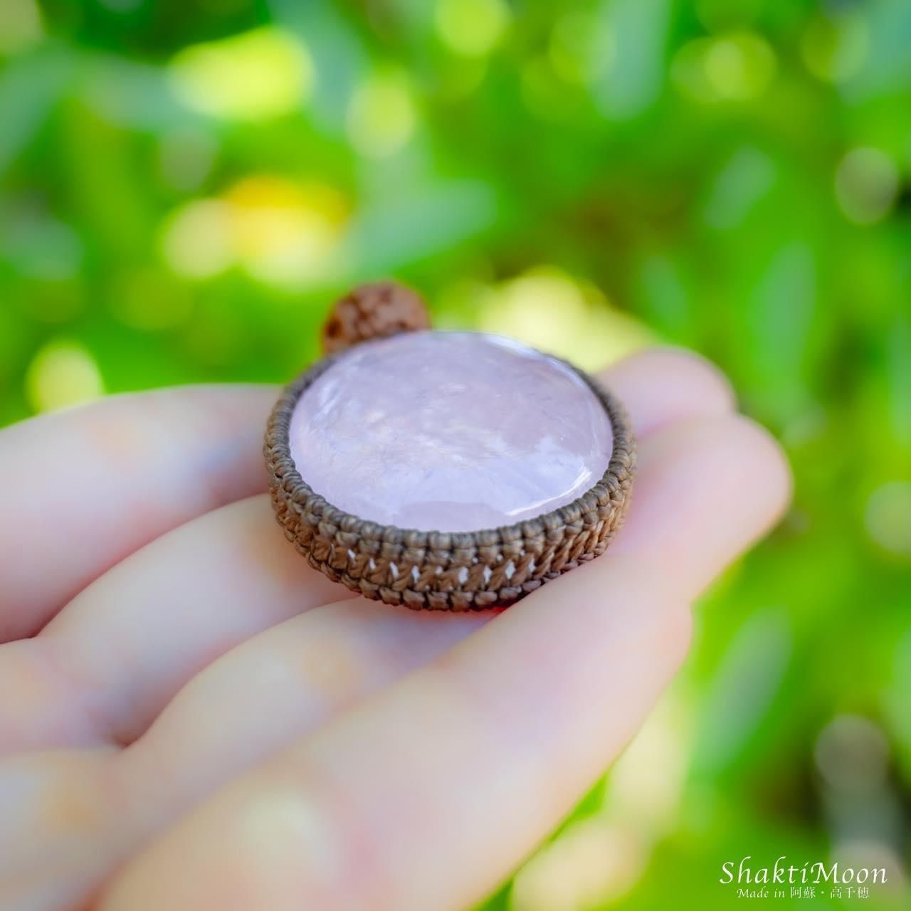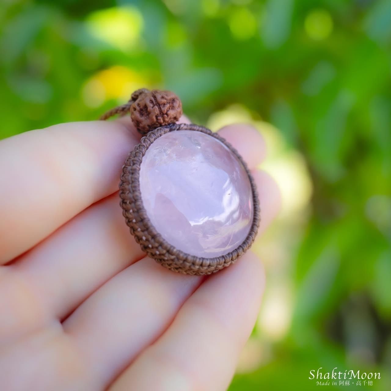 ローズクォーツの上にルドラクシャをひと粒組み合わせ、後ろからも持ち主様をお守りしてくれるように紐のエンド部分にも2粒ずつルドラクシャをお付けいたしました!