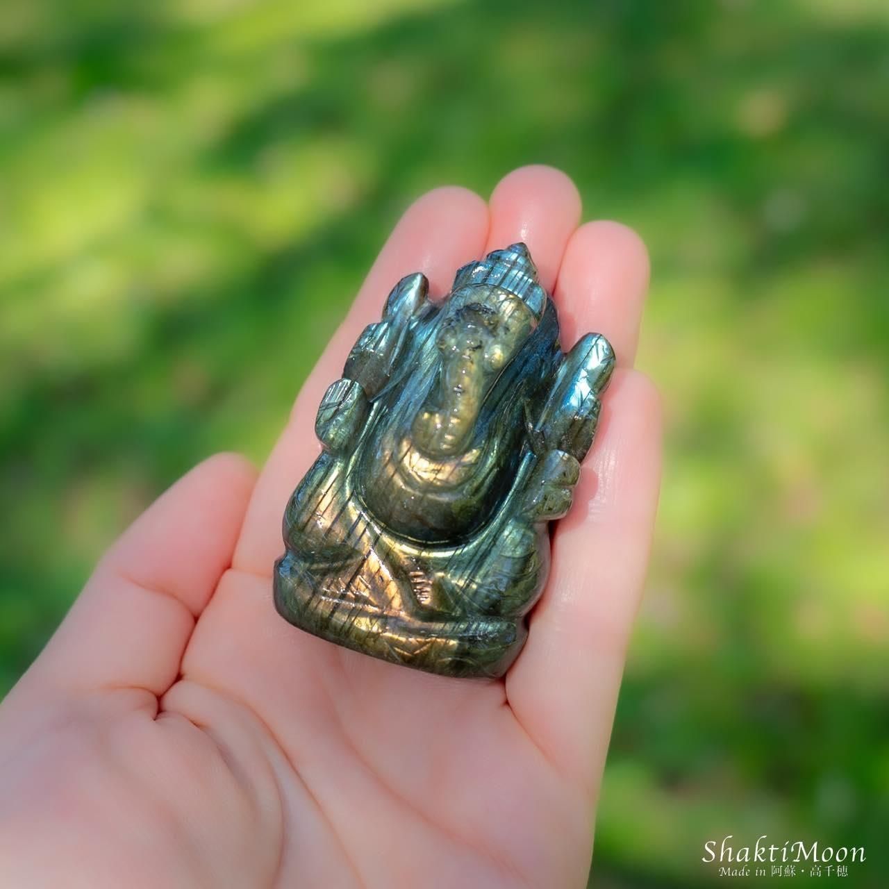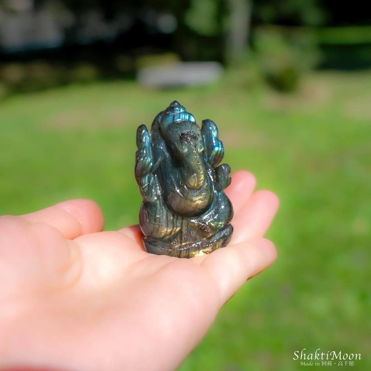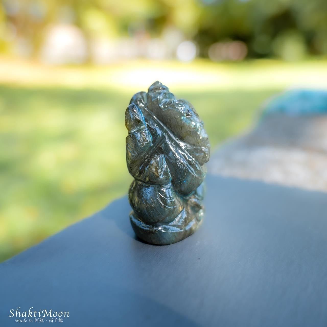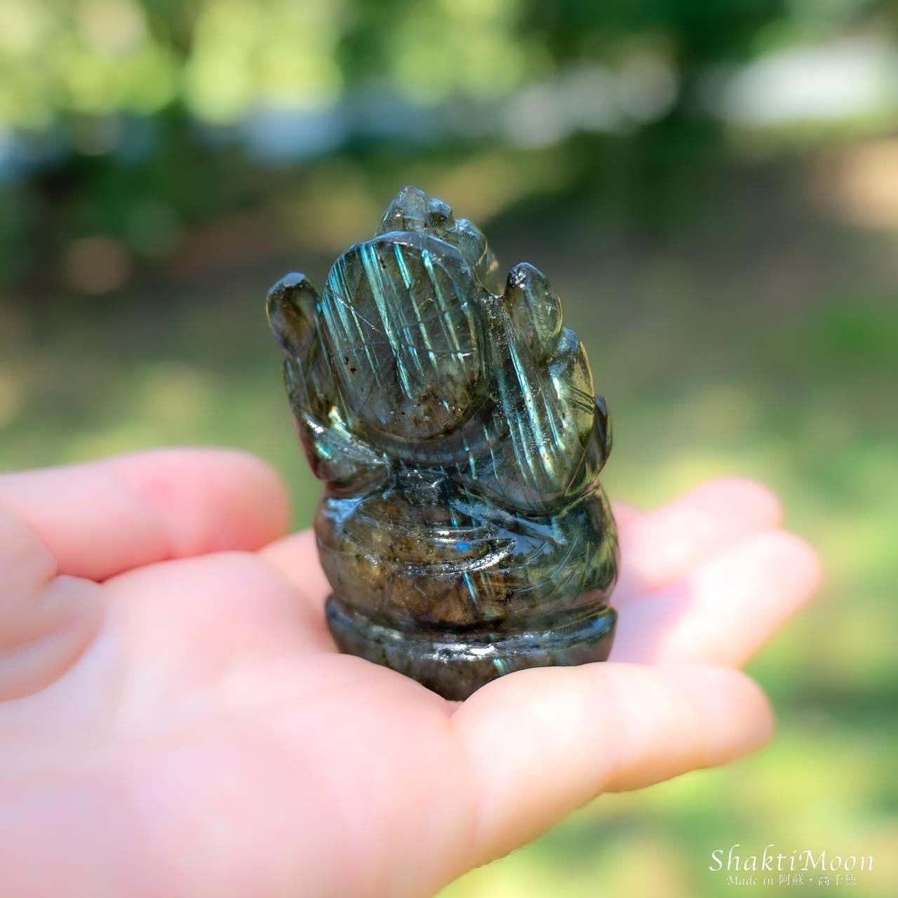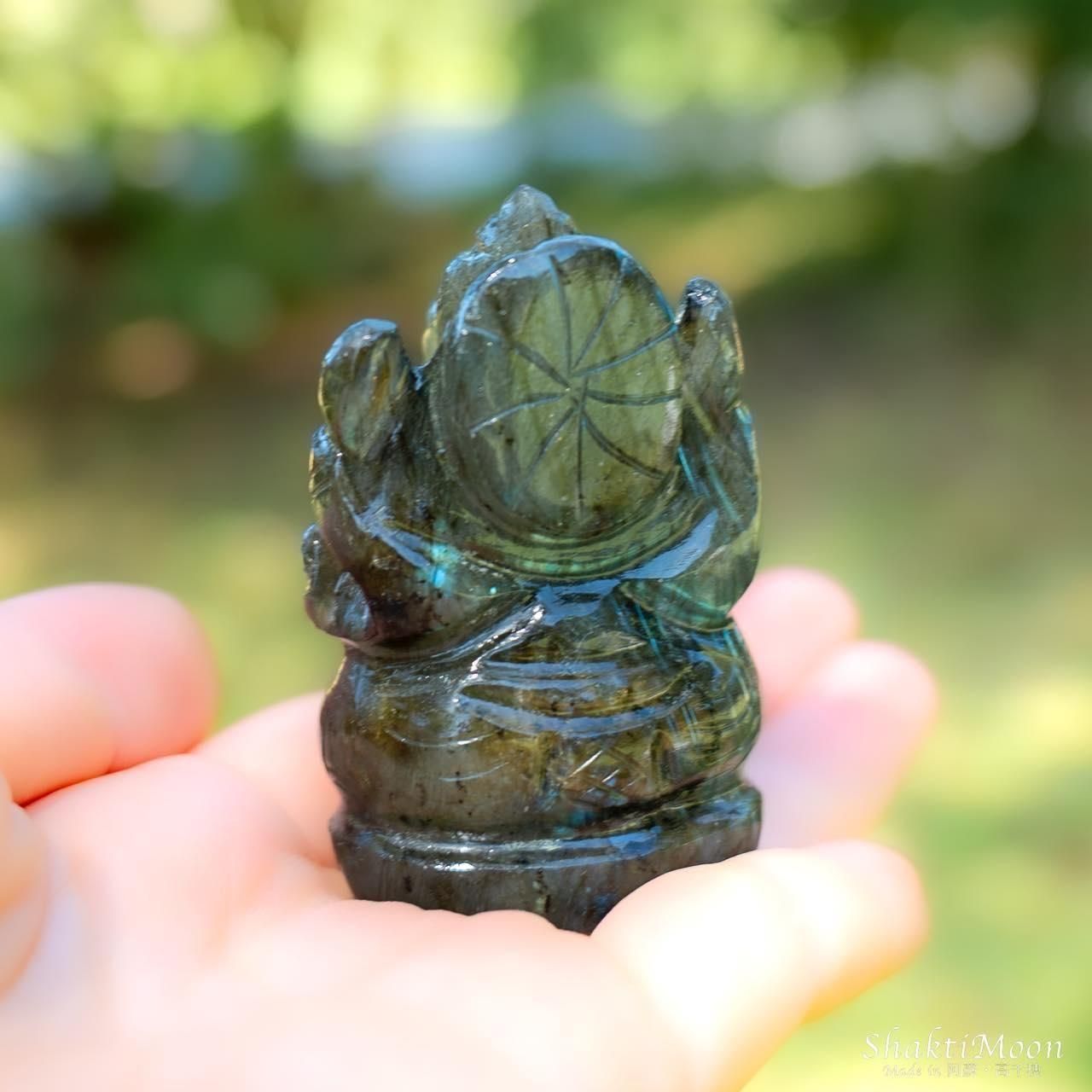 美しいマルチカラーのシラーをもつラブラドライトで彫られたガネーシャ神像は、
