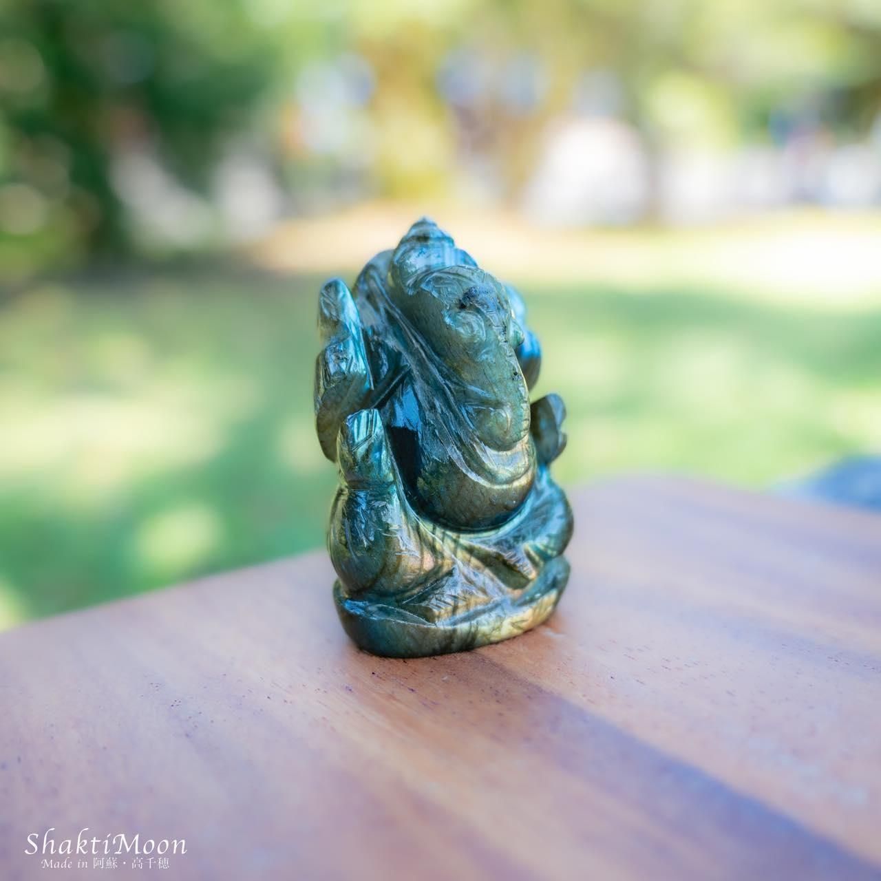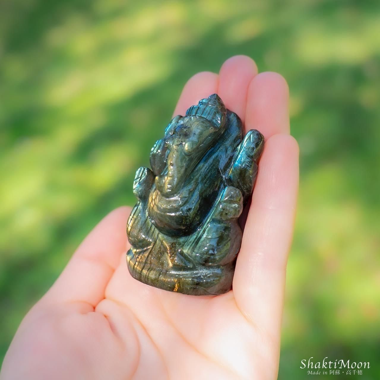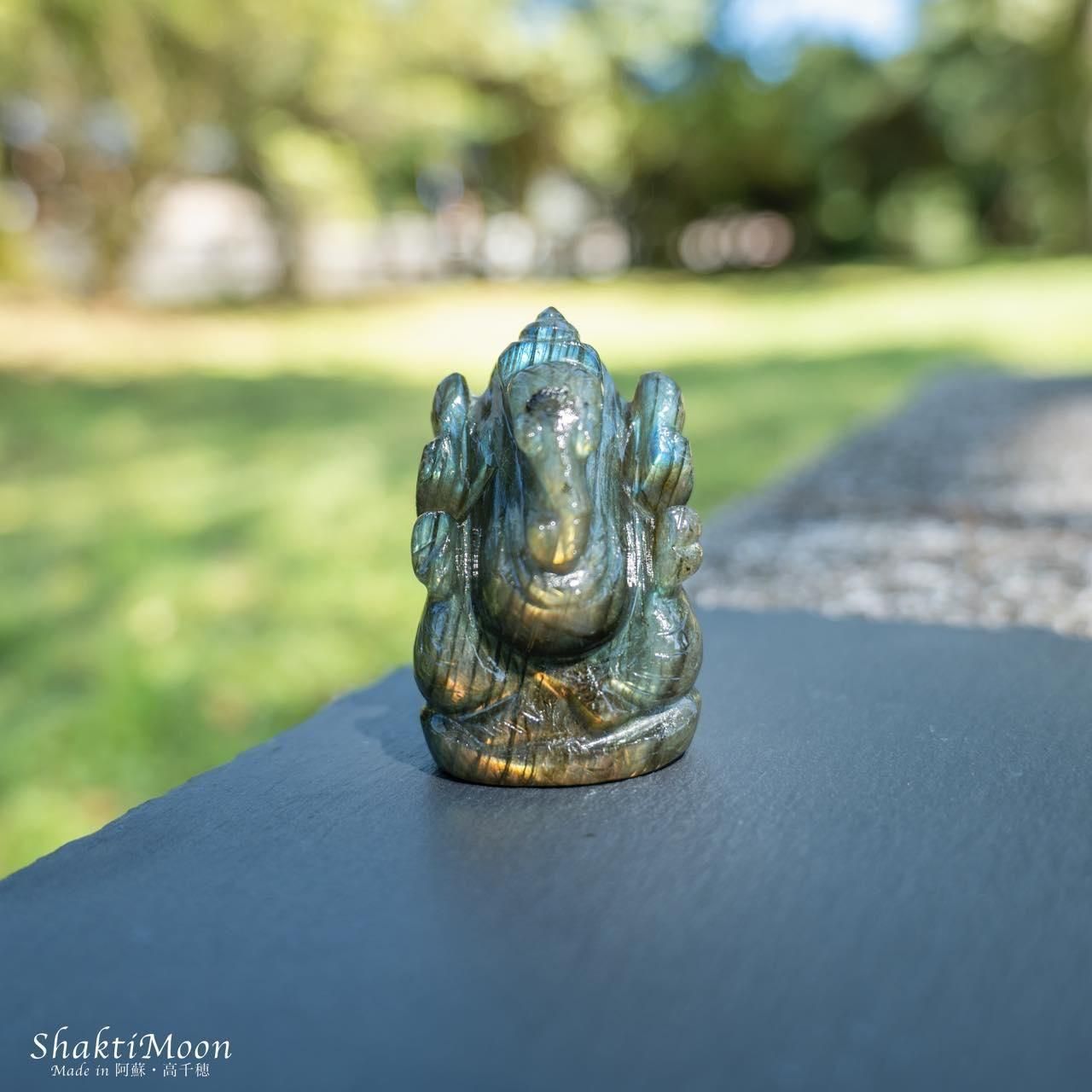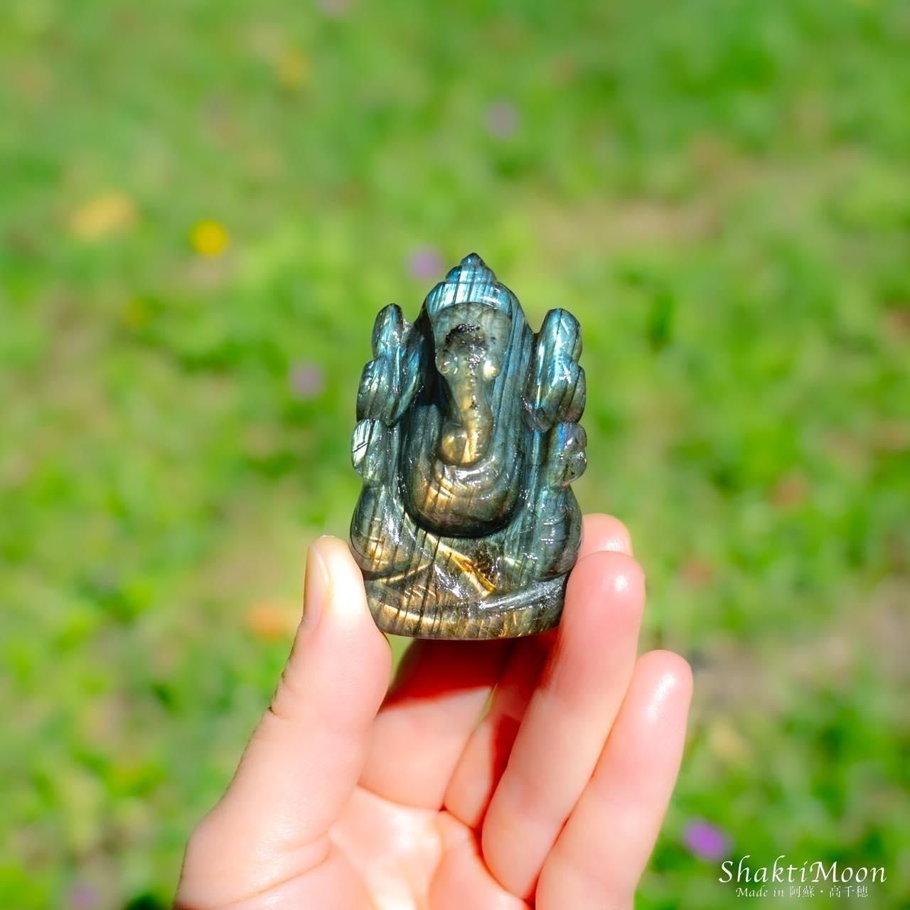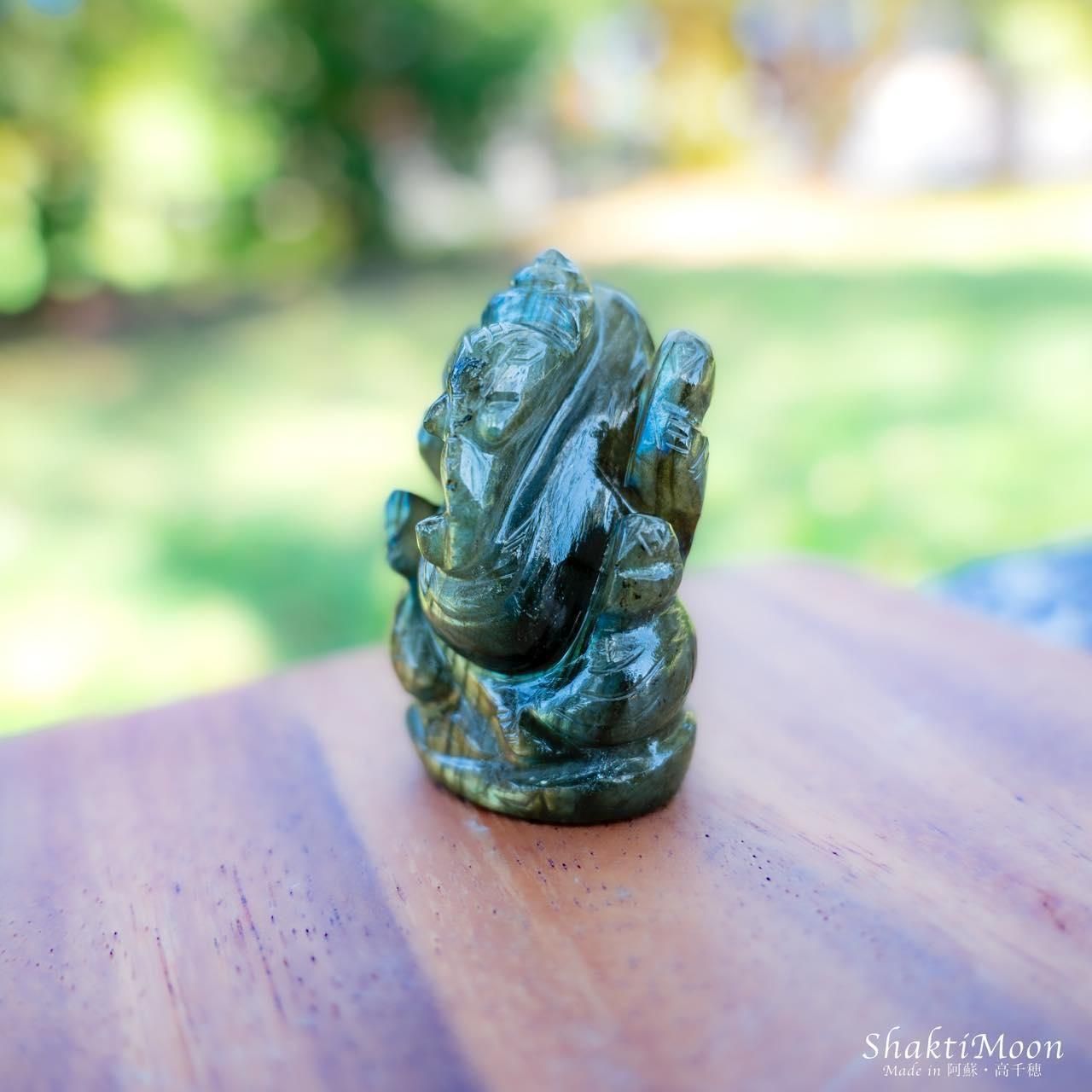 美しいマルチカラーのシラーをもつラブラドライトで彫られたガネーシャ神像は、